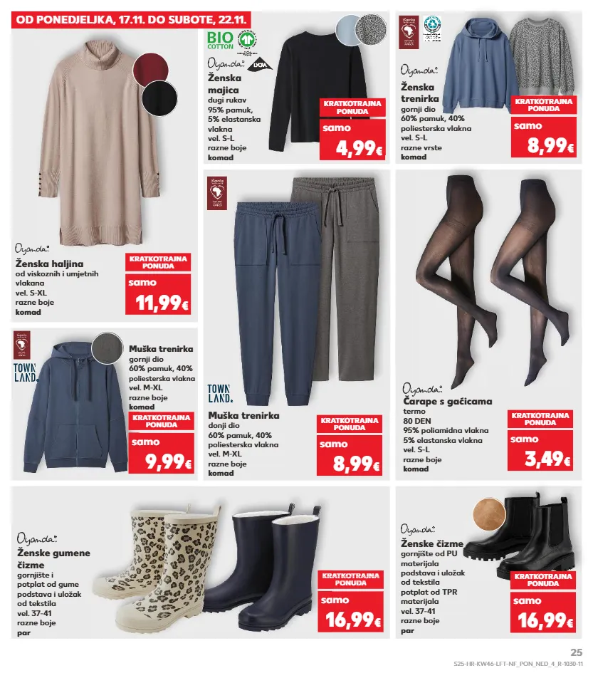 od ponedjeljka, 17.11. do subote, 22.11. ženske gumene čizme gornjište i potplat od gume podstava i uložak od tekstila vel. 37-41 razne boje par ženske čizme gornjište od pu materijala podstava i uložak od tekstila potplat od tpr materijala vel. 37-41 razne boje par kratkotrajna ponuda kratkotrajna ponuda samo samo kratkotrajna ponuda super cijena kratkotrajna super cijena kratkotrajna ponuda super cijena onuda 16,99 € 16,99 € ženska majica dugi rukav 95% pamuk, 5% elastanska vlakna vel. s-l razne boje komad ženska trenirka gornji dio 60% pamuk, 40% poliesterska vlakna vel. s-l razne vrste komad kratkotrajna ponuda kratkotrajna ponuda samo samo 4,99 € 8,99 € muška trenirka gornji dio 60% pamuk, 40% poliesterska vlakna vel. m-xl razne boje komad kratkotrajna ponuda samo 9,99 € muška trenirka donji dio 60% pamuk, 40% poliesterska vlakna vel. m-xl razne boje komad čarape s gaćicama termo 80 den 95% poliamidna vlakna 5% elastanska vlakna vel. s-l razne boje komad kratkotrajna ponuda kratkotrajna ponuda samo samo 8,99 € 3,49 € ženska haljina od viskoznih i umjetnih vlakana vel. s-xl razne boje komad kratkotrajna ponuda samo 11,99 € s25-hr-kw46-lft-nf_pon_ned_4_r-1030-11 25