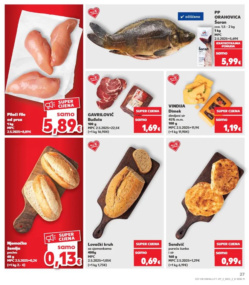 kratkotrajna ponuda samo kratkotrajna ponuda samo kratkotrajna ponuda samo samo kratkotrajna ponuda samo ✓ očišćeno ✓ očišćeno vindija dimek dimljeni sir 45% m.m. 100 g mpc 2.5.2025=11,9€ (=1 kg 11,90€) sendvič pureća šunka i sir 160 g mpc 2.5.2025=1,29€ (=1 kg 6,19€) super cijena 1,19 € samo lovački kruh sa sjemenkama 400g mpc 2.5.2025=1,05€ (=1 kg 1,73€) (=1 kg 2.- €) super cijena 0,69 € samo super cijena 0,99 € samo pp orahovica šaran cca. 1,5 - 2 kg 1 kg mpc 2.5.2025=5,69€ kratkotrajna ponuda 5,99 € samo pileći file od prsa 1 kg mpc 2.5.2025=8,89€ (=1 kg 16,90€) gavrilović buđola 100 g mpc 2.5.2025=22,5€ super cijena 1,69 € samo njemačka žemlja pecivo 65 g mpc 2.5.2025=0,2€ 0,1 3 0,13 € € samo super cijena 5,8 9 5,89 € € samo super cijena s27-hr-kw46-lft-vp_2_ned_2_r-1030-11 27