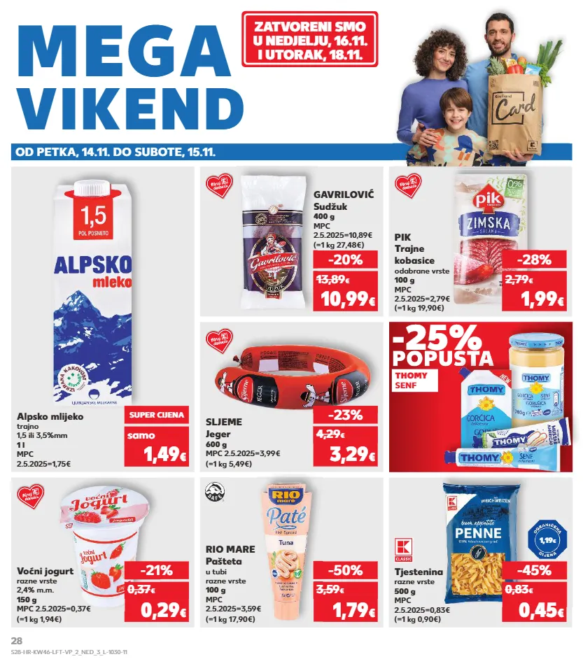 kratkotrajna ponuda samo kratkotrajna ponuda samo kratkotrajna ponuda samo kratkotrajna ponuda samo kratkotrajna ponuda samo kratkotrajna ponuda samo kratkotrajna ponuda samo thomy senf -25% popusta voćni jogurt razne vrste 2,4% m.m. 150 g mpc 2.5.2025=0,37€ (=1 kg 1,94€) sljeme jeger 600 g mpc 2.5.2025=3,99€ (=1 kg 5,49€) -21% 0,29 € 0,37 € -23% 3,29 € 4,29 € -28% 1,99 € 2,79 € (=1 kg 19,90€) pik trajne kobasice odabrane vrste 100 g mpc 2.5.2025=2,79€ super cijena 1,49 € samo alpsko mlijeko trajno 1,5 ili 3,5%mm 1 l mpc 2.5.2025=1,75€ -20% 10,99 € 13,89 € (=1 kg 27,48€) gavrilović sudžuk 400 g mpc 2.5.2025=10,89€ (=1 kg 0,90€) tjestenina razne vrste 500 g mpc 2.5.2025=0,83€ -45% 0,45 € 0,83 € 1,19 € rio mare pašteta u tubi razne vrste 100 g mpc 2.5.2025=3,59€ (=1 kg 17,90€) -50% 1,79 € 3,59 € popusta zatvoreni smo u nedjelju, 16.11. i utorak, 18.11. vikend mega od petka, 14.11. do subote, 15.11. s28-hr-kw46-lft-vp_2_ned_3_l-1030-11 28