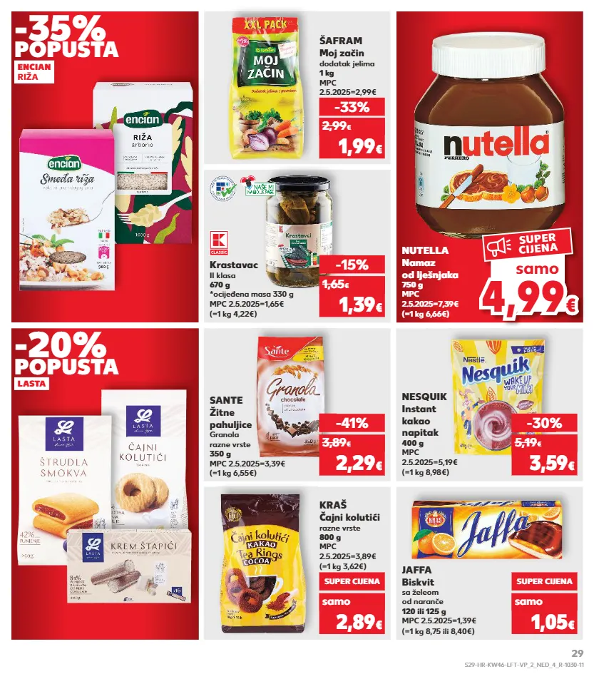 kratkotrajna ponuda samo kratkotrajna ponuda samo kratkotrajna ponuda samo kratkotrajna ponuda samo kratkotrajna ponuda samo kratkotrajna ponuda samo encian riža lasta -35% -20% popusta popusta nesquik instant kakao napitak 400 g mpc 2.5.2025=5,19€ (=1 kg 8,98€) kraš čajni kolutići razne vrste 800 g mpc 2.5.2025=3,89€ (=1 kg 3,62€) super cijena 2,89 € samo -30% 3,59 € 5,19 € šafram moj začin dodatak jelima 1 kg mpc 2.5.2025=2,99€ -33% 1,99 € 2,99 € (=1 kg 6,55€) sante žitne pahuljice granola razne vrste 350 g mpc 2.5.2025=3,39€ -41% 2,29 € 3,89 € krastavac ii klasa 670 g *ocijeđena masa 330 g mpc 2.5.2025=1,65€ (=1 kg 4,22€) -15% 1,39 € 1,65 € jaffa biskvit sa želeom od naranče 120 ili 125 g mpc 2.5.2025=1,39€ (=1 kg 8,75 ili 8,40€) super cijena 1,05 € samo nutella namaz od lješnjaka 750 g mpc 2.5.2025=7,39€ (=1 kg 6,66€) 4,99 4,99 € € samo super cijena s29-hr-kw46-lft-vp_2_ned_4_r-1030-11 29