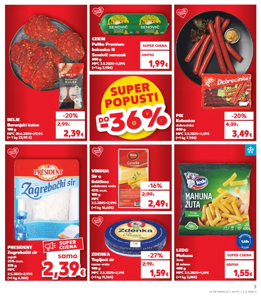 kratkotrajna ponuda samo kratkotrajna ponuda samo kratkotrajna ponuda samo kratkotrajna ponuda samo kratkotrajna ponuda kratkotrajna ponuda samo super popusti popusti -36% -36% do ledo mahune žute ili zelene 400 g mpc 2.5.2025=1,59€ (=1 kg 3,88€) super cijena 1,55 € samo belje baranjski kulen 100 g mpc 20.6.2025=29,9€ (= 1 kg 23,90 €) vindija sir u listićima odabrane vrste 45% m.m. 150 g mpc 2.5.2025=2,99€ (=1 kg 16,60€) -16% 2,49 € 2,99 € zdenka topljeni sir razne vrste 140 g mpc 2.5.2025=2,19€ (=1 kg 11,36€) -27% 1,59 € 2,19 € -20% 2,39 € 2,99 € (=1 kg 6.38€) president zagrebački sir svježi 25% m.m. 375 g mpc 2.5.2025=2,99€ kratkotrajna ponuda samo super cijena 2,39 € (=1 kg 3,98€) cekin poliko premium kobasica ili sendvič narezak 500 g mpc 2.5.2025=2,89€ samo super cijena 1,99 € (=1 kg 7.94€) pik kobasica debrecinka 440 g mpc 2.5.2025=4,39€ -20% 3,49 € 4,39 € 1,60 € samo super cijena 2,39 € 2,3 9 2,39 € € samo super cijena s3-hr-kw46-lft-aktf1_1_2_r-1030-11 3
