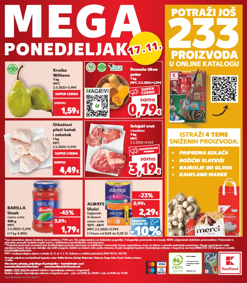 kratkotrajna ponuda samo kratkotrajna ponuda ponuda - p tkotrajna ponuda kratkotrajna ponuda samo kratkotrajna ponuda samo pefc/23-31-86 pefc certified this product is from sustainably managed forests www.pefc.co.uk 233 u online katalogu potraži još proizvoda istraži 4 teme sniženih proizvoda: ponedjeljak mega *sve navedene cijene izražene su u eurima s pdv-om. ne odgovaramo za tiskarske pogreške. fotografije proizvoda ne moraju 100% odgovarati dotičnim proizvodima. proizvode iz aktualne ponude možete kupiti samo u količinama predviđenim za kućanstvo. **pojedini proizvodi označeni kao kratkotrajna ponuda dostupni su količinski i vremenski strogo ograničeno, te je za istima u pravilu potražnja povećana. stoga upućujemo naše cijenjene kupce da je sve detalje oko istih moguće dobiti na našem info-pultu izravno, ili pak unaprijed putem upravljanja odnosa s kupcima, na broj 0800/223 223 ili putem e.maila kontakt@kaufland.hr mpc=maloprodajna cijena u smislu čl. 4. st. 1. t. 11. zakona o zaštiti potrošača (nn 19/22, 59/23) 0800 / 223 223 (besplatni telefon upravljanja odnosa s kupcima) radno vrijeme upravljanja odnosa s kupcima: pon - pet, od 8:00 do 20:00 / sub od 8:00 do 17:00 ako imate pitanja, prijedloge ili primjedbe – kontaktirajte nas! www.kaufland.hr/kontakt www.kaufland.hr/facebook ponedjeljak mega mega mega 1 7 . 1 1 . 1 7 . 1 1 . • priprema kolača • kaufland marke • najbolje od gljiva • božićni slatkiši barilla umak razne vrste 400 g mpc 2.5.2025=3,29€ (=1 kg 4,48€) -45% 1,79 € 3,29 € domaća tikva puter 1 kg mpc 2.5.2025=1,29€ k a u f l a n d k v a l i t e t a o b e ć a n j e s v j e ž i n e samo kratkotrajna p - 36% tkotrajna 36% ponuda 36% 1,59 € o 2,49 samo 2,49 samo 2,4 samo 2,49 samo samo € o € o kruška williams 1 kg mpc 2.5.2025=2,49€ super cijena super cijena 4,49 € samo otkošteni pileći batak i zabatak 1 kg mpc 2.5.2025=5,99€ svinjski vrat s kostima 1 kg mpc 2.5.2025=4,15€ 0,7 9 0,79 € € samo super cijena k a u f l a n d k v a l i t e t a o b e ć a n j e s v j e ž i n e 2.5.2025=4,15€ 2.5.2025=4,15€ 3,19 € € samo kratkotrajna ponuda ponuda vrijedi za sve kaufl and trgovine osim: velika gorica, rovinj, makarska, vukovar, dugo selo, poreč, vodice, ivanec i lučko. dodatna ušteda uz (=1 kom od 0,04 do 0,20 €) always ulošci higijenski ili dnevni razne vrste 12/1 - 60/1 mpc 2.5.2025=2,99€ -23% 2,29 € 2,99 € - - 10% 10% s32-hr-kw46-lft-rs-1030-11