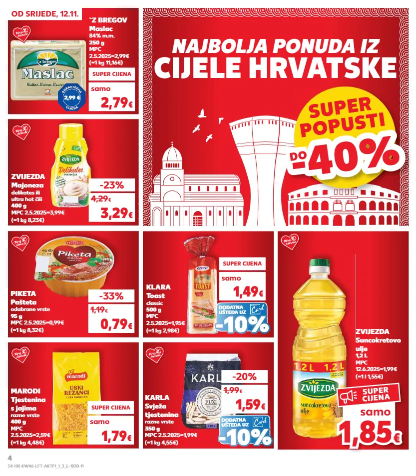 1,49 € kratkotrajna ponuda samo kratkotrajna ponuda samo kratkotrajna ponuda kratkotrajna ponuda samo kratkotrajna ponuda samo kratkotrajna ponuda najbolja ponuda iz cijele hrvatske od srijede, 12.11. piketa pašteta odabrane vrste 95 g mpc 2.5.2025=0,99€ (=1 kg 8,32€) -33% 0,79 € 1,19 € zvijezda majoneza delikates ili ultra hot čili 400 g mpc 2.5.2025=3,99€ (=1 kg 8,23€) zvijezda suncokretovo ulje 1,2 l mpc 12.6.2025=1,99€ (=1 l 1,55€) marodi tjestenina s jajima razne vrste 400 g mpc 2.5.2025=2,59€ (=1 kg 4,48€) karla svježa tjestenina razne vrste 350 g mpc 2.5.2025=1,99€ (=1 kg 4,55€) -23% 3,29 € 4,29 € samo super cijena 1,79 € -20% 1,59 € 1,99 € super cijena 2,79 € (=1 kg 11,16€) `z bregov maslac 84% m.m. 250 g mpc 2.5.2025=2,99€ dodatna ušteda uz (=1 kg 2,98€) klara toast classic 500 g mpc 2.5.2025=1,95€ super cijena samo 1,49 € - - 10% 10% 2,99 € dodatna ušteda uz - - 10% 10% samo super popusti popusti -40% -40% do 1,8 5 1,85 € € samo super cijena s4-hr-kw46-lft-aktf1_1_3_l-1030-11 4