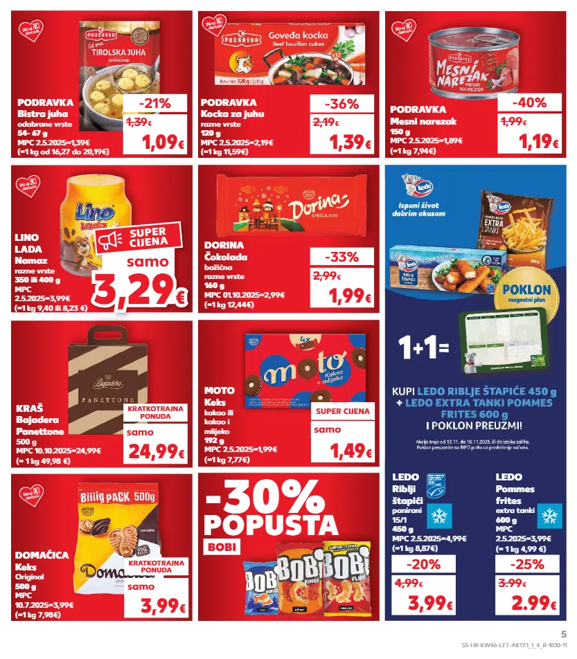 kratkotrajna ponuda samo super cijena kratkotrajna ponuda samo kratkotrajna ponuda samo kratkotrajna ponuda samo kratkotrajna ponuda samo kratkotrajna ponuda samo kratkotrajna ponuda samo samo -25% 3.99 € dorina čokolada božićna razne vrste 160 g mpc 01.10.2025=2,99€ (=1 kg 12,44€) -33% 1,99 € 2,99 € moto keks kakao ili kakao i mlijeko 192 g mpc 2.5.2025=1,99€ (=1 kg 7,77€) super cijena 1,49 € domaćica keks original 500 g mpc 10.7.2025=3,99€ (=1 kg 7,98€) kratkotrajna ponuda samo 3,99 € ledo riblji štapići panirani 15/1 450 g mpc 2.5.2025=4,99€ (=1 kg 8,87€) ledo pommes frites extra tanki 600 g mpc 2.5.2025=3,99€ (= 1 kg 4,99 €) -20% 3,99 € 4,99 € 2.99 € (=1 kg 11,59€) podravka kocka za juhu razne vrste 120 g mpc 2.5.2025=2,19€ -36% 1,39 € 2,19 € (=1 kg od 16,27 do 20,19€) podravka bistra juha odabrane vrste 54- 67 g mpc 2.5.2025=1,39€ -21% 1,09 € 1,39 € (=1 kg 9,40 ili 8,23 €) lino lada namaz razne vrste 350 ili 400 g mpc 2.5.2025=3,99€ podravka mesni narezak 150 g mpc 2.5.2025=1,89€ (=1 kg 7,94€) -40% 1,19 € 1,99 € -30% popusta bobi kraš bajadera panettone 500 g mpc 10.10.2025=24,99€ (= 1 kg 49,98 €) kratkotrajna ponuda 24,99 € samo samo 3,29 3,29 € € samo super cijena s5-hr-kw46-lft-aktf1_1_4_r-1030-11 5