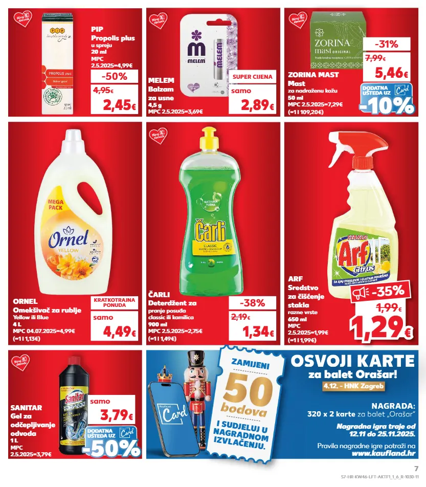 kratkotrajna ponuda samo kratkotrajna ponuda kratkotrajna ponuda samo kratkotrajna ponuda samo pravila nagradne igre potraži na www.kaufl and.hr nagradna igra traje od 12.11 do 25.11.2025. 320 x 2 karte za balet „orašar“ nagrada: 1,29 € -35 % 1,99 € zamijeni i sudjeluj u nagradnom izvlačenju. osvoji karte 320 x 2 karte za balet „orašar“ nagrada: osvoji osvoji karte za balet orašar! 4.12. - hnk zagreb ornel omekšivač za rublje yellow ili blue 4 l mpc 04.07.2025=4,99€ (=1 l 1,13€) kratkotrajna ponuda samo 4,49 € čarli deterdžent za pranje posuđa classic ili kamilica 900 ml mpc 2.5.2025=2,75€ (=1 l 1,49€) -38% 1,34 € 2,19 € arf sredstvo za čišćenje stakla razne vrste 650 ml mpc 2.5.2025=1,99€ (=1 l 1,99€) melem balzam za usne 4,5 g mpc 2.5.2025=3,69€ samo super cijena 2,89 € pip propolis plus u spreju 20 ml mpc 2.5.2025=4,99€ -50% 2,45 € 4,95 € dodatna ušteda uz (=1 l 109,20€) zorina mast mast za nadraženu kožu 50 ml mpc 2.5.2025=7,29€ -31% 5,46 € 7,99 € - - 10% 10% samo 3,79 € sanitar gel za odčepljivanje odvoda 1 l mpc 2.5.2025=3,79€ - - 50% 50% dodatna ušteda uz s7-hr-kw46-lft-aktf1_1_6_r-1030-11 7