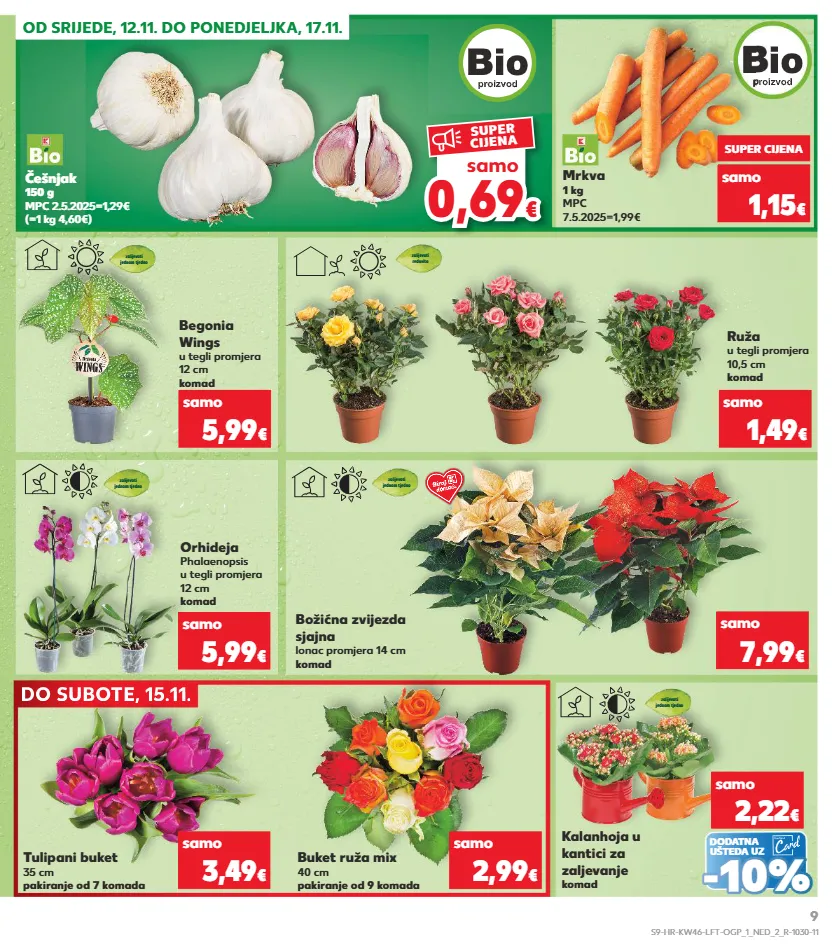 kratkotrajna ponuda do subote, 15.11. do subote, 15.11. do subote, 15.11. 0,6 9 0,69 € € samo super cijena (=1 kg 4,60€) češnjak 150 g mpc 2.5.2025=1,29€ mrkva 1 kg mpc 7.5.2025=1,99€ samo super cijena 1,15 € orhideja phalaenopsis u tegli promjera 12 cm komad zalijevati jednom tjedno zalijevati jednom tjedno samo 5,99 € tulipani buket 35 cm pakiranje od 7 komada buket ruža mix 40 cm pakiranje od 9 komada samo samo 3,49 € 2,99 € begonia wings u tegli promjera 12 cm komad ruža u tegli promjera 10,5 cm komad božićna zvijezda sjajna lonac promjera 14 cm komad zalijevati jednom tjedno zalijevati redovito zalijevati jednom tjedno samo samo samo 5,99 € 1,49 € 7,99 € dodatna ušteda uz kalanhoja u kantici za zaljevanje komad samo 2,22 € - - 10% 10% od srijede, 12.11. do ponedjeljka, 17.11. s9-hr-kw46-lft-ogp_1_ned_2_r-1030-11 9