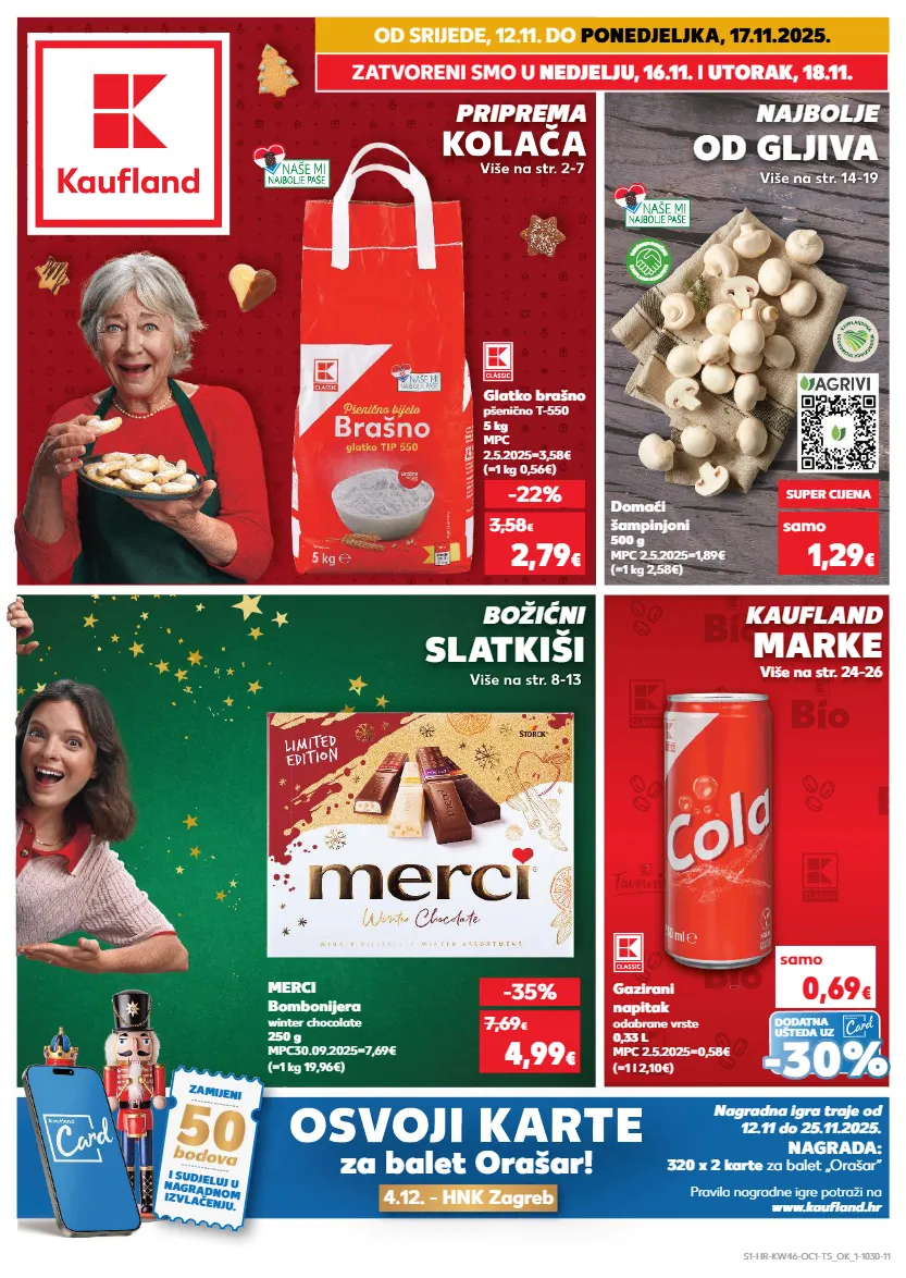 iste cijene na kopnu i na moru! samo kratkotrajna ponuda samo kratkotrajna ponuda kratkotrajna ponuda od srijede, 12.11. do ponedjeljka, 17.11.2025. više na str. 2-7 više na str. 8-13 više na str. 14-19 kaufland marke više na str. 8-13 božićni slatkiši više na str. 14-19 najbolje od gljiva više na str. 2-7 više na str. 2-7 više na str. 2-7 više na str. 2-7 više na str. 2-7 više na str. 2-7 više na str. 2-7 priprema kolača više na str. 24-26 zatvoreni smo u nedjelju, 16.11. i utorak, 18.11. osvoji karte osvoji osvoji karte za balet orašar! 4.12. - hnk zagreb zamijeni i sudjeluj u nagradnom izvlačenju. pravila nagradne igre potraži na www.kaufl and.hr nagradna igra traje od 12.11 do 25.11.2025. 320 x 2 karte za balet „orašar“ nagrada: više na str. 2-7 više na str. 2-7 više na str. 2-7 kolača kolača kolača kolača kolača kolača kolača više na str. 14-19 više na str. 14-19 7,69 € (=1 kg 19,96€) merci bombonijera winter chocolate 250 g mpc30.09.2025=7,69€ -22% 2,79 € 3,58 € (=1 kg 0,56€) glatko brašno pšenično t-550 5 kg mpc 2.5.2025=3,58€ k a u f l a n d k v a l i t e t a o b e ć a n j e s v j e ž i n e samo super cijena 1,29 € (=1 kg 2,58€) domaći šampinjoni 500 g mpc 2.5.2025=1,89€ samo 0,69 € (=1 l 2,10€) gazirani napitak odabrane vrste 0,33 l mpc 2.5.2025=0,58€ - - 30% 30% dodatna ušteda uz -35% 4,99 € s1-hr-kw46-oc1-ts_ok_1-1030-11
