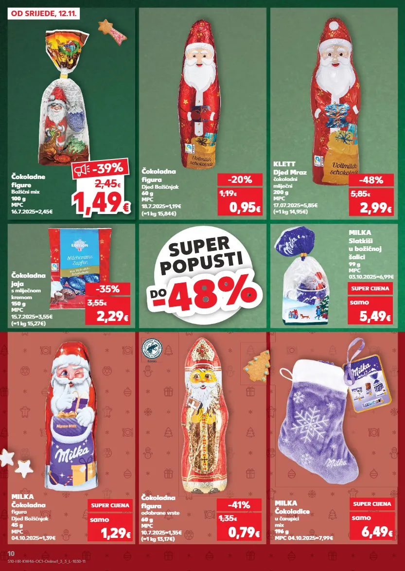 KRATKOTRAJNA PONUDA samo KRATKOTRAJNA PONUDA samo KRATKOTRAJNA PONUDA KRATKOTRAJNA PONUDA KRATKOTRAJNA PONUDA samo KRATKOTRAJNA PONUDA samo KRATKOTRAJNA PONUDA 1,49 € € -39 % 2,45 € SUPER POPUSTI POPUSTI -48% -48% DO OD SRIJEDE, 12.11. Čokoladne figure Božićni mix 100 g MPC 16.7.2025=2,45€ Čokoladna figura Djed Božićnjak 60 g MPC 18.7.2025=1,19€ (=1 kg 15,84€) Čokoladna figura odabrane vrste 60 g MPC 10.7.2025=1,35€ (=1 kg 13,17€) MILKA Čokoladice u čarapici mix 196 g MPC 04.10.2025=7,99€ MILKA Slatkiši u božićnoj šalici 99 g MPC 03.10.2025=6,99€ KLETT Djed Mraz čokoladni mliječni 200 g MPC 17.07.2025=5,85€ (=1 kg 14,95€) -20% 0,95 € 1,19 € -41% 0,79 € 1,35 € samo SUPER CIJENA 6,49 € samo SUPER CIJENA 5,49 € -48% 2,99 € 5,85 € -35% 2,29 € 3,55 € (=1 kg 15,27€) Čokoladna jaja s mliječnom kremom 150 g MPC 15.7.2025=3,55€ samo SUPER CIJENA 1,29 € MILKA Čokoladna figura Djed Božićnjak 45 g MPC 04.10.2025=1,39€ S10-HR-KW46-OC1-Online1_3_3_L-1030-11 10