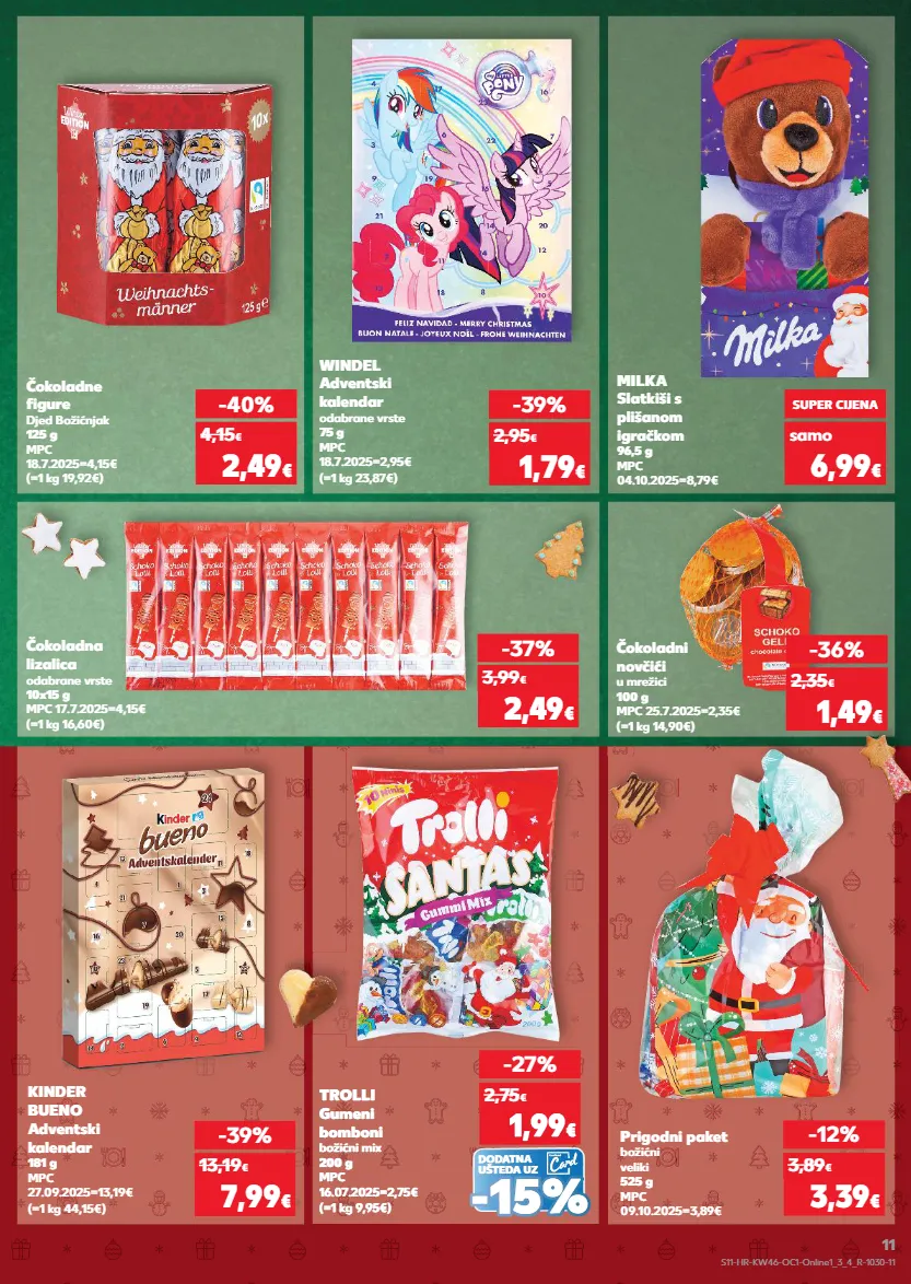 kratkotrajna ponuda samo kratkotrajna ponuda samo kratkotrajna ponuda samo kratkotrajna ponuda samo kratkotrajna ponuda samo kratkotrajna ponuda samo kratkotrajna ponuda kratkotrajna ponuda samo čokoladne figure djed božićnjak 125 g mpc 18.7.2025=4,15€ (=1 kg 19,92€) prigodni paket božićni veliki 525 g mpc 09.10.2025=3,89€ -12% 3,39 € 3,89 € kinder bueno adventski kalendar 181 g mpc 27.09.2025=13,19€ (=1 kg 44,15€) -40% 2,49 € 4,15 € -39% 7,99 € 13,19 € windel adventski kalendar odabrane vrste 75 g mpc 18.7.2025=2,95€ (=1 kg 23,87€) -39% 1,79 € 2,95 € -36% 1,49 € 2,35 € (=1 kg 14,90€) čokoladni novčići u mrežici 100 g mpc 25.7.2025=2,35€ (=1 kg 16,60€) čokoladna lizalica odabrane vrste 10x15 g mpc 17.7.2025=4,15€ -37% 2,49 € 3,99 € milka slatkiši s plišanom igračkom 96,5 g mpc 04.10.2025=8,79€ samo super cijena 6,99 € dodatna ušteda uz (=1 kg 9,95€) trolli gumeni bomboni božićni mix 200 g mpc 16.07.2025=2,75€ -27% 1,99 € 2,75 € - - 15% 15% s11-hr-kw46-oc1-online1_3_4_r-1030-11 11