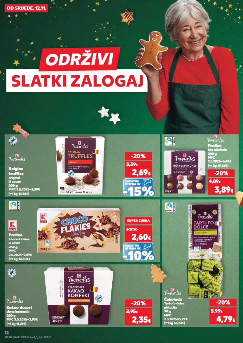 2,59 € kratkotrajna ponuda samo kratkotrajna ponuda samo kratkotrajna ponuda samo kratkotrajna ponuda samo kratkotrajna ponuda slatki zalogaj slatki zalogaj održivi slatki zalogaj od srijede, 12.11. praline bez alkohola 200 g mpc 2.5.2025=5,49€ (=1 kg 19,45€) -20% 3,89 € 4,89 € kakao desert slana karamela 200 g mpc 2.5.2025=2,95€ (=1 kg 11,75€) -20% 2,35 € 2,95 € -20% 4,79 € 5,99 € (=1 kg 53,23€) čokolada tartufo dolce pistacija 90 g mpc 2.5.2025=5,99€ (=1 kg 13,45€) belgian truffles original ili cacao 200 g mpc 2.5.2025=3,39€ dodatna ušteda uz -20% 2,69 € 3,39 € - - 15% 15% dodatna ušteda uz (=1 kg 10,40€) praline choco flakies ili white 250 g mpc 2.5.2025=2,59€ super cijena samo 2,60 € - - 10% 10% s12-hr-kw46-oc1-online1_3_5_l-1030-11 12