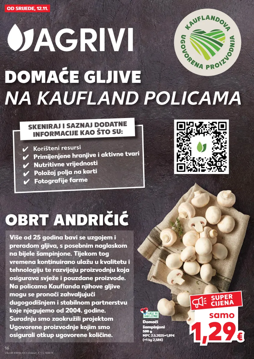 DOMAĆE GLJIVE NA KAUFLAND POLICAMA OBRT ANDRIČIĆ OD SRIJEDE, 12.11. Domaći šampinjoni 500 g MPC 2.5.2025=1,89€ (=1 kg 2,58€) ✓ Korišteni resursi ✓ Primijenjene hranjive i aktivne tvari ✓ Nutritivne vrijednosti ✓ Položaj polja na karti ✓ Fotografije farme Više od 25 godina bavi se uzgojem i preradom gljiva, s posebnim naglaskom na bijele šampinjone. Tijekom tog vremena kontinuirano ulažu u kvalitetu i tehnologiju te razvijaju proizvodnju koja osigurava svježe i pouzdane proizvode. Na policama Kaufl anda njihove gljive mogu se pronaći zahvaljujući dugogodišnjem i stabilnom partnerstvu koje njegujemo od 2004. godine. Suradnju smo zaokružili projektom Ugovorene proizvodnje kojim smo osigurali otkup ugovorene količine. Korišteni resursi SKENIRAJ I SAZNAJ DODATNE INFORMACIJE KAO ŠTO SU: 1,29 1,29 € € samo SUPER CIJENA S16-HR-KW46-OC1-Online1_4_1_L-1030-11 16