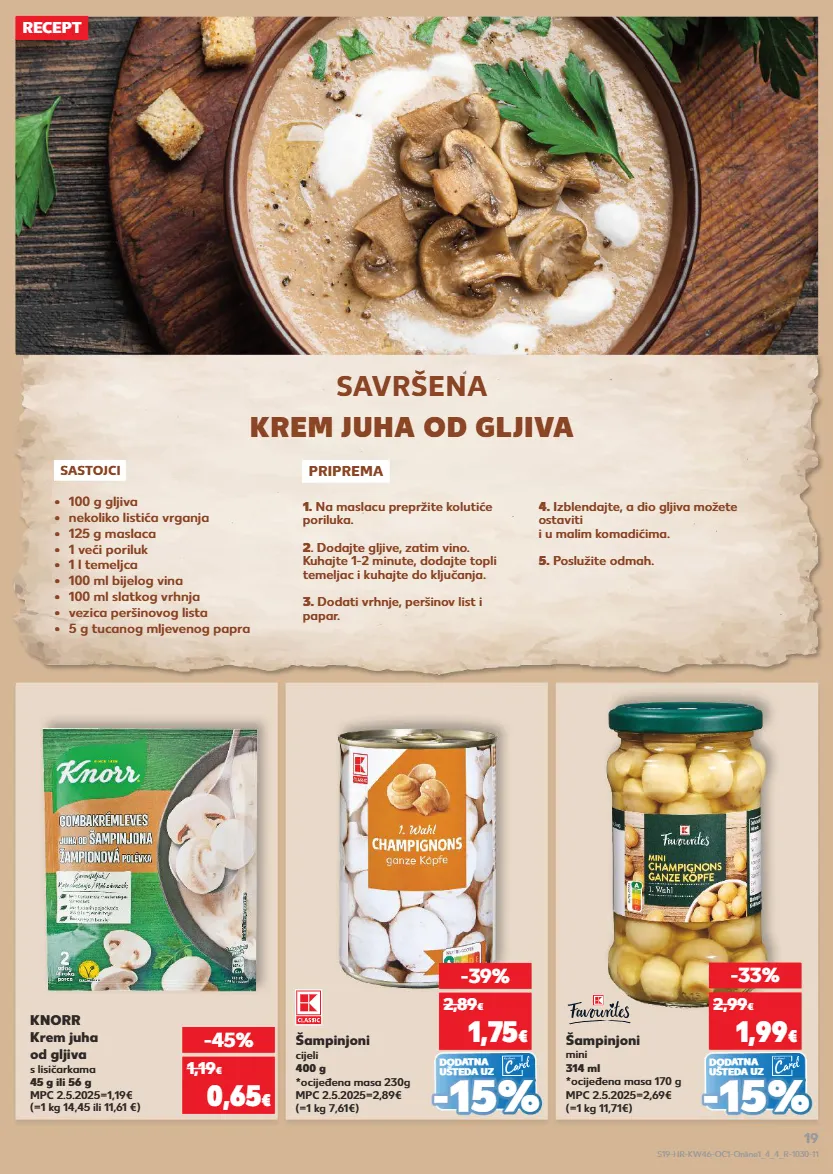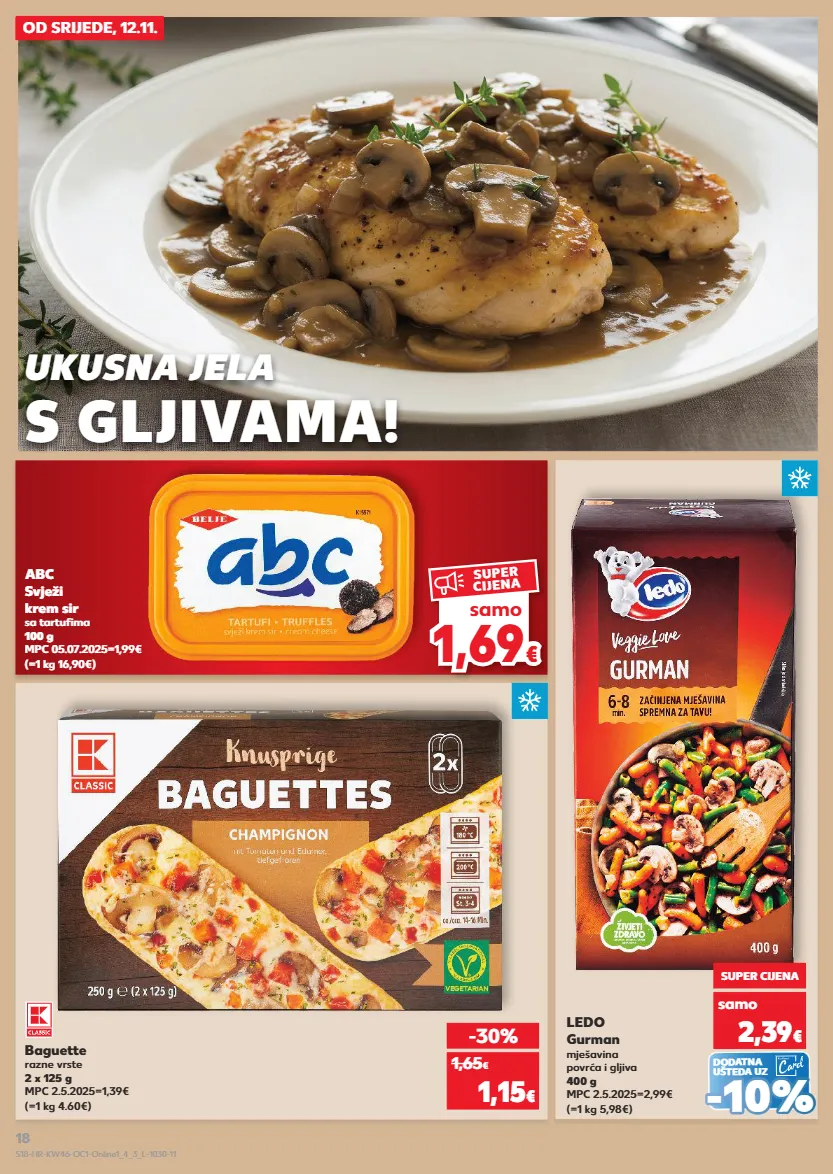 2,24 € kratkotrajna ponuda samo kratkotrajna ponuda od srijede, 12.11. ukusna jela s gljivama! baguette razne vrste 2 x 125 g mpc 2.5.2025=1,39€ (=1 kg 4.60€) abc svježi krem sir sa tartufima 100 g mpc 05.07.2025=1,99€ (=1 kg 16,90€) -30% 1,15 € 1,65 € dodatna ušteda uz (=1 kg 5,98€) ledo gurman mješavina povrća i gljiva 400 g mpc 2.5.2025=2,99€ samo super cijena 2,39 € - - 10% 10% 1,6 9 1,69 € € samo super cijena s18-hr-kw46-oc1-online1_4_3_l-1030-11 18