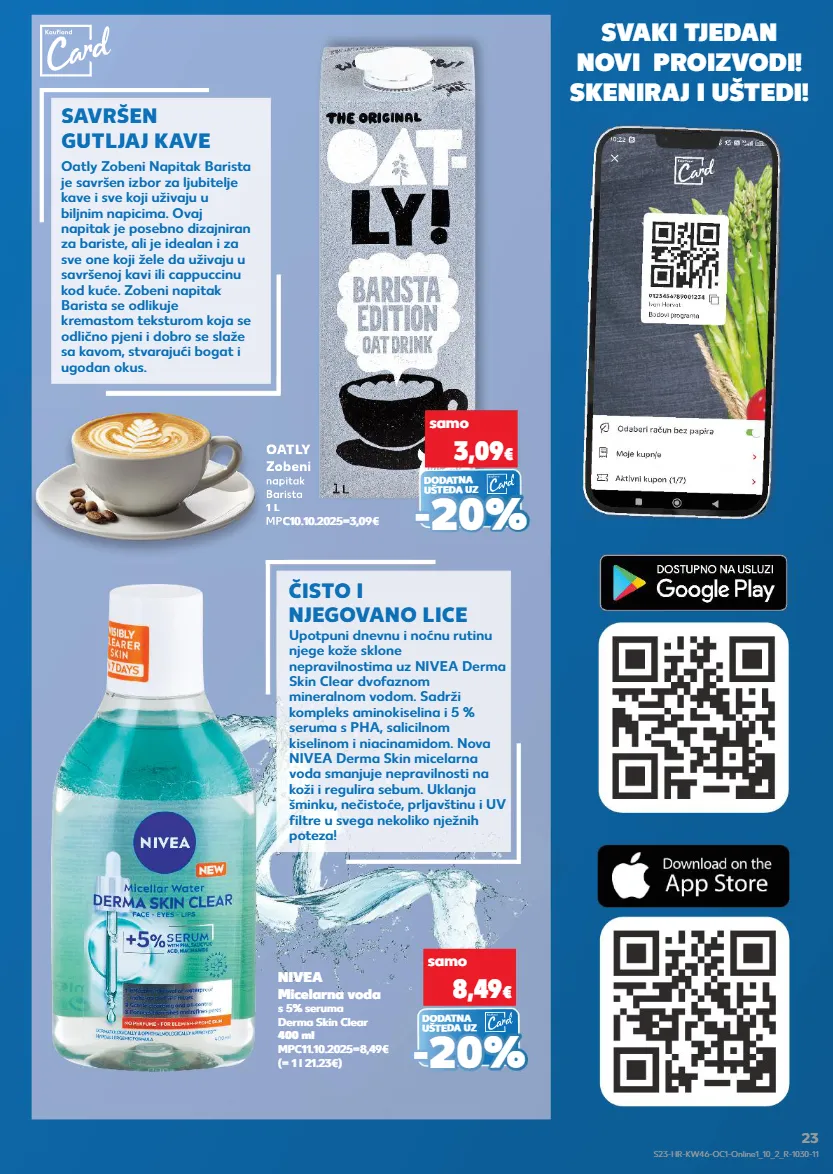 1 L SVAKI TJEDAN NOVI PROIZVODI! SKENIRAJ I UŠTEDI! ČISTO I NJEGOVANO LICE SAVRŠEN GUTLJAJ KAVE Upotpuni dnevnu i noćnu rutinu njege kože sklone nepravilnostima uz NIVEA Derma Skin Clear dvofaznom mineralnom vodom. Sadrži kompleks aminokiselina i 5 % seruma s PHA, salicilnom kiselinom i niacinamidom. Nova NIVEA Derma Skin micelarna voda smanjuje nepravilnosti na koži i regulira sebum. Uklanja šminku, nečistoće, prljavštinu i UV filtre u svega nekoliko nježnih poteza! Oatly Zobeni Napitak Barista je savršen izbor za ljubitelje kave i sve koji uživaju u biljnim napicima. Ovaj napitak je posebno dizajniran za bariste, ali je idealan i za sve one koji žele da uživaju u savršenoj kavi ili cappuccinu kod kuće. Zobeni napitak Barista se odlikuje kremastom teksturom koja se odlično pjeni i dobro se slaže sa kavom, stvarajući bogat i ugodan okus. OATLY Zobeni napitak Barista MPC10.10.2025=3,09€ samo 3,09 € - - 20 % 20 % DODATNA UŠTEDA UZ (= 1 l 21.23€) NIVEA Micelarna voda s 5% seruma Derma Skin Clear 400 ml MPC11.10.2025=8,49€ samo 8,49 € - - 20 % 20 % DODATNA UŠTEDA UZ OATLY Zobeni napitak Barista 1 L MPC10.10.2025=3,09€ S23-HR-KW46-OC1-Online1_10_2_R-1030-11 23