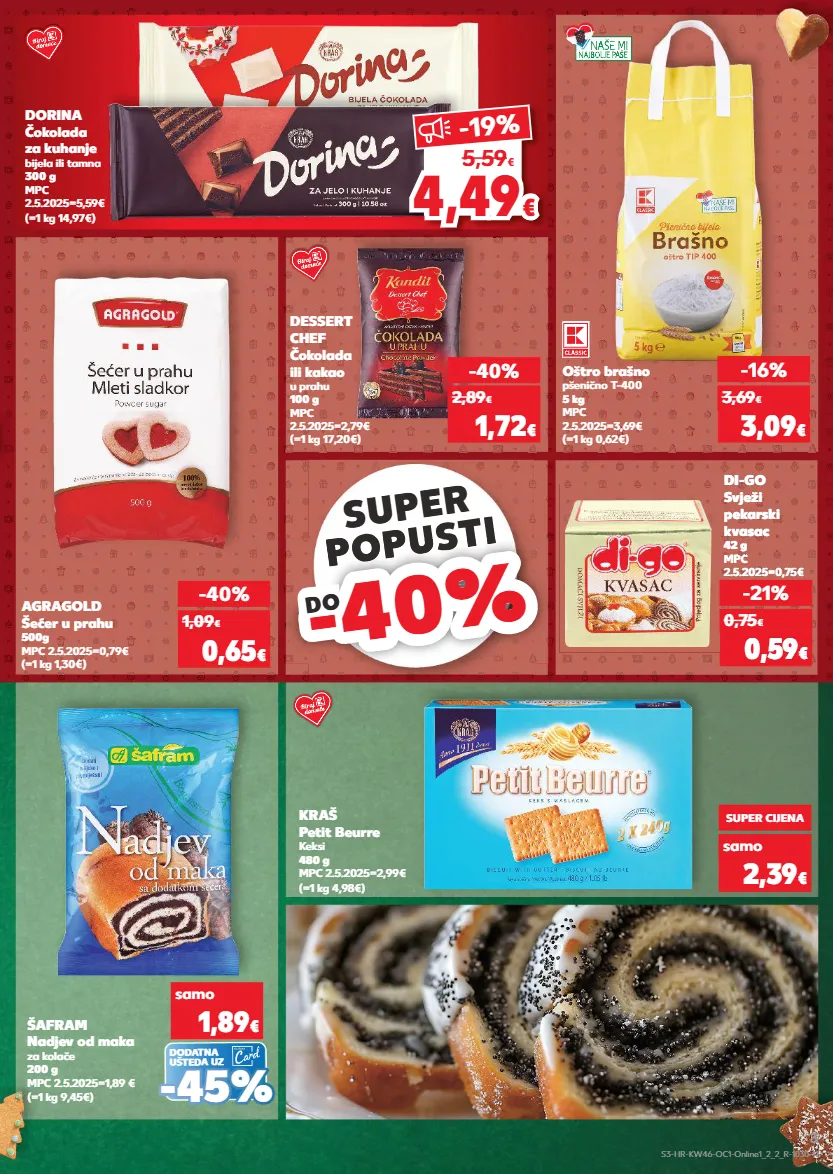 kratkotrajna ponuda samo kratkotrajna ponuda kratkotrajna ponuda samo kratkotrajna ponuda samo kratkotrajna ponuda samo super popusti popusti -40% -40% do (=1 kg 9,45€) šafram nadjev od maka za kolače 200 g mpc 2.5.2025=1,89 € samo 1,89 € - - 45 % 45 % dodatna ušteda uz dorina čokolada za kuhanje bijela ili tamna 300 g mpc 2.5.2025=5,59€ (=1 kg 14,97€) di-go svježi pekarski kvasac 42 g mpc 2.5.2025=0,75€ -21% 0,59 € 0,75 € kraš petit beurre keksi 480 g mpc 2.5.2025=2,99€ (=1 kg 4,98€) samo super cijena 2,39 € (=1 kg 17,20€) dessert chef čokolada ili kakao u prahu 100 g mpc 2.5.2025=2,79€ -40% 1,72 € 2,89 € (=1 kg 1,30€) agragold šećer u prahu 500g mpc 2.5.2025=0,79€ -40% 0,65 € 1,09 € (=1 kg 0,62€) oštro brašno pšenično t-400 5 kg mpc 2.5.2025=3,69€ -16% 3,09 € 3,69 € 4,4 9 4,49 € € -19% 5,59 € s3-hr-kw46-oc1-online1_2_2_r-1030-11 3