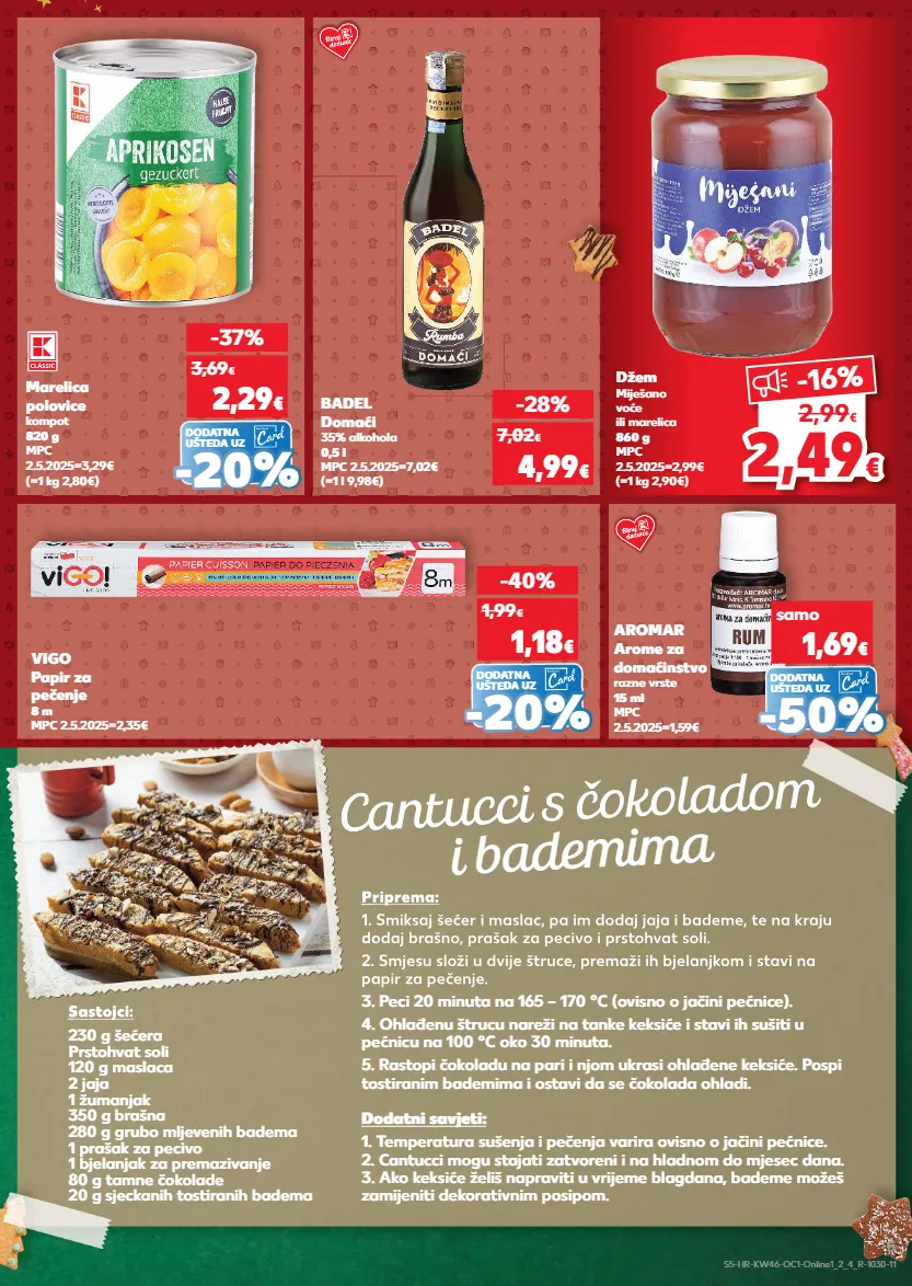 kratkotrajna ponuda samo kratkotrajna ponuda samo kratkotrajna ponuda samo cantucci s čokoladom i bademima sastojci: 230 g šećera prstohvat soli 120 g maslaca 2 jaja 1 žumanjak 350 g brašna 280 g grubo mljevenih badema 1 prašak za pecivo 1 bjelanjak za premazivanje 80 g tamne čokolade 20 g sjeckanih tostiranih badema priprema: 1. smiksaj šećer i maslac, pa im dodaj jaja i bademe, te na kraju dodaj brašno, prašak za pecivo i prstohvat soli. 2. smjesu složi u dvije štruce, premaži ih bjelanjkom i stavi na papir za pečenje. 3. peci 20 minuta na 165 – 170 °c (ovisno o jačini pećnice). 4. ohlađenu štrucu nareži na tanke keksiće i stavi ih sušiti u pećnicu na 100 °c oko 30 minuta. 5. rastopi čokoladu na pari i njom ukrasi ohlađene keksiće. pospi tostiranim bademima i ostavi da se čokolada ohladi. dodatni savjeti: 1. temperatura sušenja i pečenja varira ovisno o jačini pećnice. 2. cantucci mogu stajati zatvoreni i na hladnom do mjesec dana. 3. ako keksiće želiš napraviti u vrijeme blagdana, bademe možeš zamijeniti dekorativnim posipom. cantucci s sastojci: priprema: 1. smiksaj šećer i maslac, pa im dodaj jaja i bademe, te na kraju dodaj brašno, prašak za pecivo i prstohvat soli. 2. smjesu složi u dvije štruce, premaži ih bjelanjkom i stavi na papir za pečenje. (=1 kg 2,90€) džem miješano voće ili marelica 860 g mpc 2.5.2025=2,99€ dodatna ušteda uz vigo papir za pečenje 8 m mpc 2.5.2025=2,35€ -40% 1,18 € 1,99 € - - 20 % 20 % (=1 l 9,98€) badel domaći 35% alkohola 0,5 l mpc 2.5.2025=7,02€ -28% 4,99 € 7,02 € dodatna ušteda uz (=1 kg 2,80€) marelica polovice kompot 820 g mpc 2.5.2025=3,29€ -37% 2,29 € 3,69 € - - 20 % 20 % aromar arome za domaćinstvo razne vrste 15 ml mpc 2.5.2025=1,59€ samo 1,69 € - - 50% 50% dodatna ušteda uz 2,4 9 2,49 € € -16% 2,99 € s5-hr-kw46-oc1-online1_2_4_r-1030-11 5