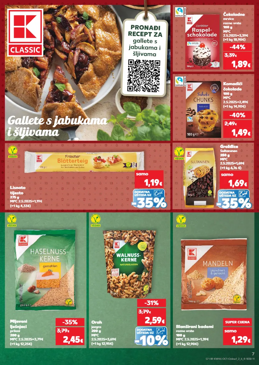 kratkotrajna ponuda samo kratkotrajna ponuda samo kratkotrajna ponuda kratkotrajna ponuda samo kratkotrajna ponuda samo gallete s jabukama i šljivama komadići čokolade 100 g mpc 2.5.2025=2,49€ (=1 kg 14,90€) -40% 1,49 € 2,49 € mljeveni lješnjaci prženi 200 g mpc 2.5.2025=3,79€ (=1 kg 12,25€) blanširani bademi razne vrste 100 g mpc 2.5.2025=1,39€ (=1 kg 12,90€) -35% 2,45 € 3,79 € samo super cijena 1,29 € (=1 kg 18,90€) čokoladne mrvice razne vrste 100 g mpc 2.5.2025=3,39€ -44% 1,89 € 3,39 € dodatna ušteda uz (=1 kg 12,95€) orah jezgra 200 g mpc 2.5.2025=3,69€ -31% 2,59 € 3,79 € - - 10% 10% (=1 kg 4,33€) lisnato tijesto 275 g mpc 2.5.2025=1,19€ samo 1,19 € - - 35 % 35 % dodatna ušteda uz (=1 kg 6,76 €) grožđice sultaninen 250 g mpc 2.5.2025=1,69€ samo 1,69 € - - 35 % 35 % dodatna ušteda uz pronađi recept za gallete s jabukama i šljivama s7-hr-kw46-oc1-online1_2_6_r-1030-11 7