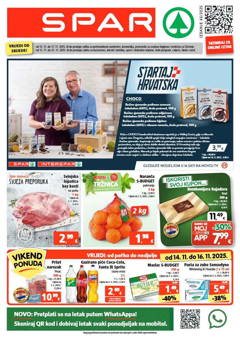 od 14. 11. do 16. 11. 2025. vrijedi: od petka do nedjelje tržnica novo: pretplati se na letak putem whatsappa! skeniraj qr kod i dobivaj letak svake srijede na mobitel. novo: pretplati se na letak putem whatsappa! skeniraj qr kod i dobivaj letak svaki ponedjeljak na mobitel. svje ž a preporuka spar mesnica svinjska lopatica bez kosti na pultu 1 kg cijena na 2. 5. 2025.: 5,19 € v i k e n d p o n u d a maslac s-budget 250 g 1 kg = 5,96 € cijena na 2. 5. 2025.: 2,79 € gazirano piće coca-cola, fanta ili sprite razne vrste 2 l 1 l = 1,05 € cijena na 2. 5. 2025.: 2,29 € pršut narezak pivac 500 g 1 kg = 21,98 € cijena na 2. 5. 2025.: 13,99 € 10 , 99 99 € -40% -40% 2,49 1 , 49 49 € € 2 , 99 99 2 , 09 09 € u cijenu uključena povratna naknada € 1 , 98 98 naranča s-budget pakiranje 2 kg 1 kg = 0,99 € cijena na 2. 5. 2025.: 2,68 € bombonijera bajadera kraš 300 g 1 kg = 38,30 € cijena na 2. 5. 2025.: 8,59 € h r v a t s k a k v a l i t e t a h r v a t s k a k v a l i t e t a h r v a t s k a k v a l i t e t a h r v a t s k a k v a l i t e t a 11 , 49 € iskoristi svoj kupon... samo uz 7 , 99 € -30% -30% choco bučine sjemenke prelivene tamnom čokoladom (60%), draže proizvod, 100 g bučine sjemenke prelivene mliječnom čokoladom (60%), draže proizvod, 100 g bučine sjemenke prelivene bijelom čokoladom (60%) s okusom naranče, draže proizvod, 100 g priča o choco handcrafted slasticama započela je u velikoj gorici, gdje su marcela i njezin otac dragutin, odlučili spojiti dvije naizgled nespojive namirnice – čokoladu i bučine sjemenke. inspiracija se rodila na putovanju, nakon susreta s jednim sličnim proizvodom, no ideja je ubrzo dobila vlastiti identitet. u hrvatskoj tada nije postojala takva poslastica, a bučine sjemenke bile su poznate ponajprije kroz ulje i slane grickalice. marcela je htjela pokazati da ova nutritivno bogata sirovina može zasjati i u slatkom obliku – obavijena slojevima čokolade. 1 kg = 39,90 € cijena na 16. 9. 2025.: 3,99 € 3 , 99 € gledajte nedjeljom u 16 sati na novoj tv -38% -38% 8,99 € 5 , 49 49 pasta za zube sensodyne whitening ili flouride 2 x 75 ml 1 l = 36,60 € cijena na 2. 5. 2025.: 7,89 € 2 kg zbog ograničenosti prostora svi proizvodi nisu dostupni u svim spar supermarketima. od 12. 11. do 17. 11. 2025. ili do prodaje zaliha za prehrambene namirnice, kozmetiku, proizvode za osobnu higijenu i sredstva za čišćenje od 12. 11. do 25. 11. 2025. ili do prodaje zaliha za kućanstvo, tekstil i tehniku, sport i slobodno vrijeme, hobi program, cvijeće, školu i ured vrijedi od srijede! i z da n j e 4 6 / 2 025 skeniraj za online letak