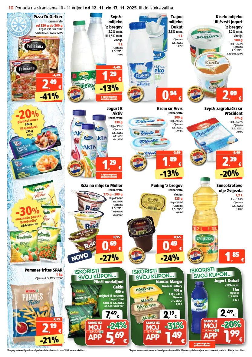 pizza dr.oetker razne vrste od 320 g do 360 g 1 kg od 6,92 € do 7,78 € cijena na 2. 5. 2025.: 4,29 € pommes frites spar 1 kg cijena na 2. 5. 2025.: 2,79 € kiselo mlijeko ili čvrsti jogurt ‘z bregov 3,2% m.m. vindija 900 g 1 kg = 2,32 € cijena na 2. 5. 2025.: 2,29 € do 2,39 € svježi zagrebački sir président 375 g 1 kg = 6,37 € cijena na 2. 5. 2025.: 2,99 € suncokretovo ulje zvijezda 1,2 l 1 l = 1,54 € cijena na 2. 5. 2025.: 1,89 € trajno mlijeko dukat 2,8% m.m. 1 l cijena na 2. 5. 2025.: 1,02 € krem sir vivis razne vrste 200 g 1 kg = 9,45 € cijena na 2. 5. 2025.: 2,19 € puding ‘z bregov razne vrste vindija 125 g 1 kg = 3,92 € cijena na 2. 5. 2025.: 0,69 € svježe mlijeko ‘z bregov 3,2% m.m. ili 1,5% m.m. vindija 1 l cijena na 2. 5. 2025.: 1,49 € jogurt b aktiv razne vrste 330 g 1 kg = 3,91 € cijena na 2. 5. 2025.: od 1,42 € do 1,62 € riža na mlijeko muller razne vrste 175 g - 200 g 1 kg od 3,45 € do 3,94 € cijena na 2. 5. 2025.: od 0,92 € do 0,95 € -24% -24% 0,65 € 0 , 49 49 -13% -13% 2,19 € 1 , 89 89 -27% -27% 0,95 € 0 , 69 69 -20% -20% 2,99 € 2 , 39 39 -41% -41% 4,29 € 2 , 49 49 -21% -21% 2,79 € 2 , 19 19 u cijenu uključena povratna naknada -13% -13% 1,49 € 1 , 29 29 u cijenu uključena povratna naknada € 1 , 29 29 € 0 , 94 94 € 2 , 0 09 9 € 1 , 85 85 - 30 % smrznuto povrće bonduelle* odabrane vrste - 20 % plodovi mora 300 g ili gamberi 250 g ledo h r v a t s k a k v a l i t e t a h r v a t s k a k v a l i t e t a h r v a t s k a k v a l i t e t a h r v a t s k a k v a l i t e t a h r v a t s k a k v a l i t e t a h r v a t s k a k v a l i t e t a h r v a t s k a k v a l i t e t a h r v a t s k a k v a l i t e t a h r v a t s k a k v a l i t e t a h r v a t s k a k v a l i t e t a h r v a t s k a k v a l i t e t a h r v a t s k a k v a l i t e t a h r v a t s k a k v a l i t e t a h r v a t s k a k v a l i t e t a h r v a t s k a k v a l i t e t a h r v a t s k a k v a l i t e t a jogurt dukat 2.8% m.m. 1 kg cijena na 2. 5. 2025.: 2,32 € namaz margo nova ili buttery 400 g 1 kg = 5,48 € cijena na 2. 5. 2025.: 2,09 € pileći medaljoni cekin 660 g original ili sa sirom 1 kg = 11,35 € cijena na 2. 5. 2025.: od 7,49 € do 8,39 € 2 , 49 € 2 , 19 € 7 , 49 € iskoristi svoj kupon... iskoristi svoj kupon... iskoristi svoj kupon... samo uz samo uz samo uz 1 , 99 € 1 , 49 € 5 , 69 € -20% -20% -31% -31% -24% -24% u cijenu uključena povratna naknada novo 10 ponuda na stranicama 10 - 11 vrijedi od 12. 11. do 17. 11. 2025. ili do isteka zaliha. *popust se ne odnosi na već snižene i promotivne artikle. cijene na polici umanjene su za navedeni postotak. slika je simbolična. zbog ograničenosti prostora svi proizvodi nisu dostupni u svim spar supermarketima.