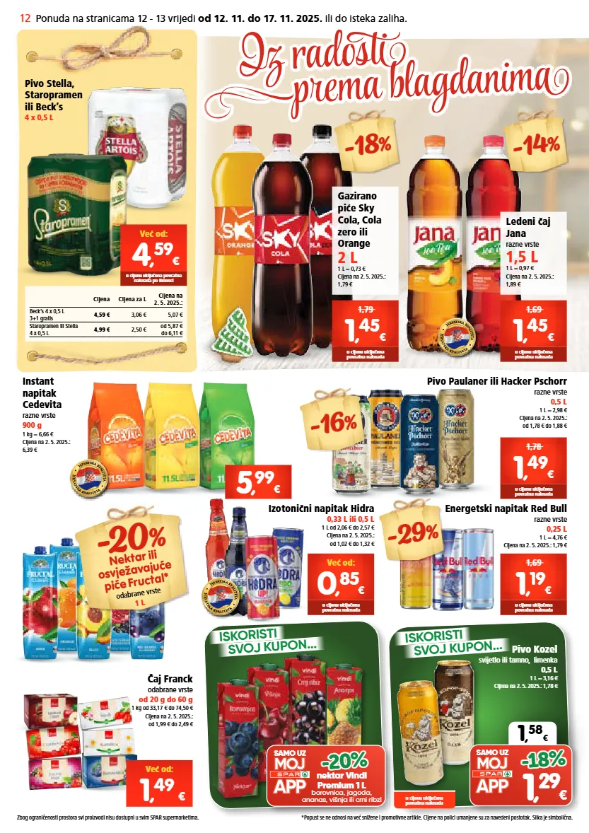1 , 58 € iskoristi svoj kupon... samo uz 1 , 29 € -18% -18% -16 -16 % % -29 -29 % % -14 -14 % % -18 -18 % % u cijenu uključena povratna naknada pivo stella, staropramen ili beck’s 4 x 0,5 l pivo paulaner ili hacker pschorr razne vrste 0,5 l 1 l = 2,98 € cijena na 2. 5. 2025.: od 1,78 € do 1,88 € energetski napitak red bull razne vrste 0,25 l 1 l = 4,76 € cijena na 2. 5. 2025.: 1,79 € instant napitak cedevita razne vrste 900 g 1 kg = 6,66 € cijena na 2. 5. 2025.: 6,39 € izotonični napitak hidra 0,33 l ili 0,5 l 1 l od 2,06 € do 2,57 € cijena na 2. 5. 2025.: od 1,02 € do 1,32 € h r v a t s k a k v a l i t e t a h r v a t s k a k v a l i t e t a h r v a t s k a k v a l i t e t a h r v a t s k a k v a l i t e t a h r v a t s k a k v a l i t e t a h r v a t s k a k v a l i t e t a pivo kozel svijetlo ili tamno, limenka 0,5 l 1 l = 3,16 € cijena na 2. 5. 2025.: 1,78 € -20 -20 % % nektar ili osvježavajuće piće fructal* odabrane vrste 1 l u cijenu uključena povratna naknada 1 , 49 € 1,78 u cijenu uključena povratna naknada 1 , 19 € 1,69 u cijenu uključena povratna naknada po limenci već od: 4 , 59 € već od: 1 , 49 € 5 , 99 € gazirano piće sky cola, cola zero ili orange 2 l 1 l = 0,73 € cijena na 2. 5. 2025.: 1,79 € 1 , 45 € 1,79 u cijenu uključena povratna naknada ledeni čaj jana razne vrste 1,5 l 1 l = 0,97 € cijena na 2. 5. 2025.: 1,89 € 1 , 45 € 1,69 u cijenu uključena povratna naknada 0 , 85 € već od: u cijenu uključena povratna naknada iskoristi svoj kupon... samo uz -20% -20% nektar vindi premium 1 l borovnica, jagoda, ananas, višnja ili crni ribzl čaj franck odabrane vrste od 20 g do 60 g 1 kg od 33,17 € do 74,50 € cijena na 2. 5. 2025.: od 1,99 € do 2,49 € cijena cijena za l cijena na 2. 5. 2025.: beck’s 4 x 0,5 l 3+1 gratis 4,59 € 3,06 € 5,07 € staropramen ili stella 4 x 0,5 l 4,99 € 2,50 € od 5,87 € do 6,11 € 12 ponuda na stranicama 12 - 13 vrijedi od 12. 11. do 17. 11. 2025. ili do isteka zaliha. *popust se ne odnosi na već snižene i promotivne artikle. cijene na polici umanjene su za navedeni postotak. slika je simbolična. zbog ograničenosti prostora svi proizvodi nisu dostupni u svim spar supermarketima.