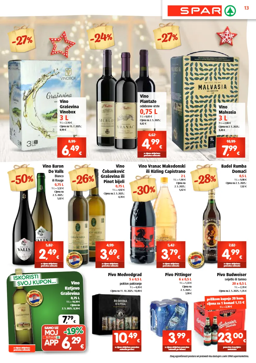 7 , 79 € iskoristi svoj kupon... samo uz 6 , 29 € -19% -19% -28 -28 % % -50 -50 % % -30 -30 % % -26 -26 % % -27 -27 % % -24 -24 % % -27 -27 % % u cijenu uključena povratna naknada pivo budweiser svijetlo ili tamno 20 x 0,5 l 1 l = 2,70 € cijena na 2. 5. 2025.: 1,35 € pivo medvedgrad 5 x 0,5 l poklon pakiranje 1 l = 4,20 € cijena na 11. 10. 2025.: 10,49 € badel rumba domaći 0,5 l 1 l = 9,98 € cijena na 2. 5. 2025.: 7,02 € vino baron de valls blanco ili rouge 0,75 l 1 l = 3,32 € cijena na 2. 5. 2025.: 5,02 € vino vranac makedonski ili rizling capistrano 2 l 1 l = 1,90 € cijena na 2. 5. 2025.: 5,42 € vino čobanković graševina ili pinot bijeli 0,75 l 1 l = 4,92 € cijena na 2. 5. 2025.: 4,78 € pivo pittinger 6 x 0,5 l 1 l = 1,33 € cijena na 2. 5. 2025.: 3,99 € h r v a t s k a k v a l i t e t a h r v a t s k a k v a l i t e t a h r v a t s k a k v a l i t e t a h r v a t s k a k v a l i t e t a h r v a t s k a k v a l i t e t a h r v a t s k a k v a l i t e t a vino kutjevo graševina 0,75 l 1 l = 10,39 € cijena na 2. 5. 2025.: 8,39 € u cijenu uključena povratna naknada 4 , 99 € 7,02 u cijenu uključena povratna naknada 3 , 79 € 5,42 u cijenu uključena povratna naknada 3 , 69 € 4,99 u cijenu uključena povratna naknada po limenci 3 , 99 € vino graševina vinobox 3 l 1 l = 2,16 € cijena na 15. 7. 2025.: 8,99 € 6 , 49 € 8,99 vino plantaže odabrane vrste 0,75 l 1 l = 6,65 € cijena na 2. 5. 2025.: 6,62 € 4 , 99 € 6,62 u cijenu uključena povratna naknada vino malvasia 3 l 1 l = 2,66 € cijena na 2. 5. 2025.: 9,49 € 7 , 99 € 10,99 2 , 49 € 5,02 u cijenu uključena povratna naknada 10 , 49 € u cijenu uključena povratna naknada po boci 23 , 00 € povratna kaucijska ambalaža prilikom kupnje 20 kom. cijena za 1 komad 1,15 € 1 l = 2,30 € 13 zbog ograničenosti prostora svi proizvodi nisu dostupni u svim spar supermarketima. 13