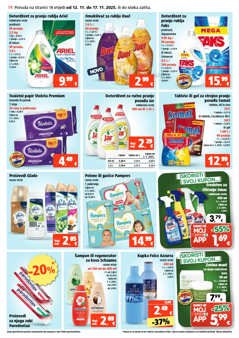 proizvodi za njegu zubi parodontax zorina mast za njegu nadražene kože 50 ml 1 l = 159,80 € cijena na 2. 5. 2025.: 7,99 € € 4 , 49 49 € 14 , 9 99 9 € 15 , 99 99 već od: € 2 , 69 69 h r v a t s k a k v a l i t e t a h r v a t s k a k v a l i t e t a h r v a t s k a k v a l i t e t a h r v a t s k a k v a l i t e t a -20 % -37% -37% 3,99 € 2 , 49 49 sredstvo za čišćenje smac odabrane vrste 650 ml 1 l = 5,83 € cijena na 2. 5. 2025.: 3,49 € deterdžent za pranje rublja ariel odabrane vrste praškasti 40 pranja, 2,2 kg 1 kg = 4,54 €, 1 pranje = 0,25 € ili tekući 40 pranja, 1,8 l 1 l = 5,55 €, 1 pranje =0,25 € cijena na 2. 5. 2025.: 17,99 € pelene ili gaćice pampers razne vrste 1 pakiranje cijena na 2. 5. 2025.: od 8,63 € do 14,99 € toaletni papir violeta premium lavanda ili pamuk 3 sloja 16 rola u pakiranju 1 rola = 0,28 € cijena na 2. 5. 2025.: 6,59 € € 9 , 99 99 šampon ili regenerator za kosu schauma razne vrste od 250 ml do 400 ml 1 l od 7,48 € do 10,76 € cijena na 2. 5. 2025. od 2,99 € do 3,99 € proizvodi glade razne vrste kupka felce azzurra razne vrste 650 ml 1 l = 3,83 € cijena na 2. 5. 2025.: 2,49 € deterdžent za ručno pranje posuđa jar odabrane vrste 900 ml ili 1,35 l deterdžent za pranje rublja faks praškasti, aquamarine 4,95 kg / 90 pranja 1 l = 3,23 € / 1 pranje = 0,18 € ili tekući, universal 4,5 l / 100 pranja 1 l 3,55 € / 1 pranje = 0,16 € cijena na 2. 5. 2025.: 18,99 € već od: € 2 , 05 05 tablete ili gel za strojno pranje posuđa somat tablete, all in one 75/1 1 tableta = 0,17 € ili tablete, excellence 4in1 50/1 1 tableta = 0,26 € ili gel 1,08 l / 60 pranja 1 l = 12,03 € / 1 pranje = 0,22 € cijena na 2. 5. 2025.: 12,99 € € 12 , 99 99 € 2 , 99 99 omekšivač za rublje duel razne vrste 1,6 l / 64 pranja 1 l = 1,87 € / 1 pranje = 0,05 € cijena na 2. 5. 2025.: 4,99 € novo 7 , 99 € 3 , 79 € iskoristi svoj kupon... iskoristi svoj kupon... samo uz samo uz 5 , 99 € 1 , 69 € -25% -25% -55% -55% cijena cijena na l cijena na 2. 5. 2025.: 900 ml 2,29 € 2,54 € 4,69 € 1,35 l 2,79 € 2,07 € 6,59 € već od: € 2 , 29 29 h r v a t s k a k v a l i t e t a h r v a t s k a k v a l i t e t a 14 ponuda na stranici 14 vrijedi od 12. 11. do 17. 11. 2025. ili do isteka zaliha. *popust se ne odnosi na već snižene i promotivne artikle. cijene na polici umanjene su za navedeni postotak. slika je simbolična. zbog ograničenosti prostora svi proizvodi nisu dostupni u svim spar supermarketima.
