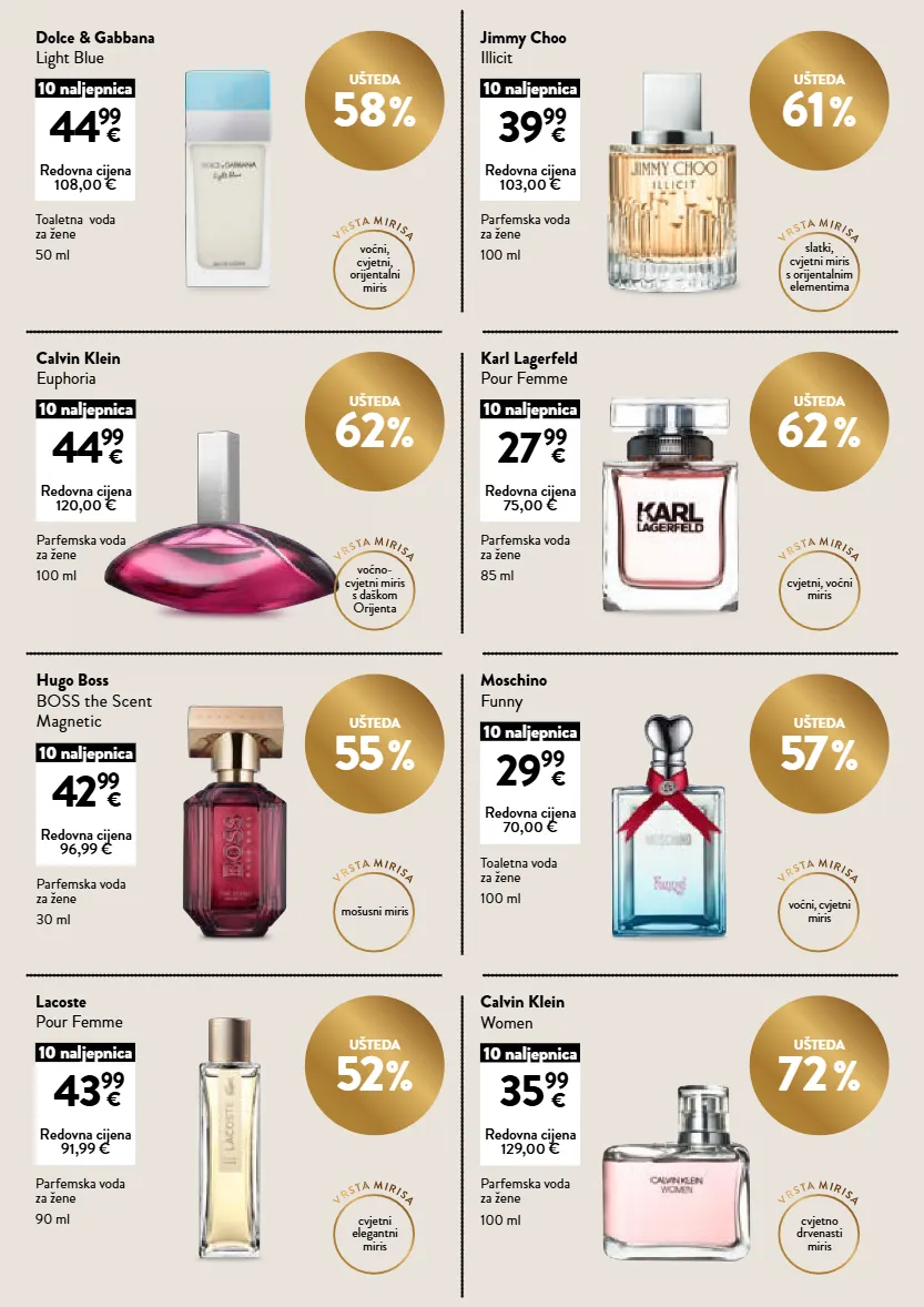 UŠTEDA 58 % UŠTEDA 62 % UŠTEDA 55 % UŠTEDA 52 % UŠTEDA 61 % UŠTEDA 62 % UŠTEDA 57 % UŠTEDA 72 % Toaletna voda za žene 50 ml Dolce & Gabbana Light Blue 44 99 10 naljepnica Redovna cijena 108,00 € € Parfemska voda za žene 100 ml Jimmy Choo Illicit 39 99 10 naljepnica Redovna cijena 103,00 € € Parfemska voda za žene 85 ml Karl Lagerfeld Pour Femme 27 99 10 naljepnica Redovna cijena 75,00 € € Parfemska voda za žene 100 ml Calvin Klein Euphoria 44 99 10 naljepnica Redovna cijena 120,00 € € V R S T A M I R I S A mošusni miris Parfemska voda za žene 30 ml Hugo Boss BOSS the Scent Magnetic 42 99 10 naljepnica Redovna cijena 96,99 € € V R S T A M I R I S A voćni, cvjetni miris Toaletna voda za žene 100 ml Moschino Funny 29 99 10 naljepnica Redovna cijena 70,00 € € V R S T A M I R I S A cvjetni elegantni miris Parfemska voda za žene 90 ml Lacoste Pour Femme 43 99 10 naljepnica Redovna cijena 91,99 € € V R S T A M I R I S A cvjetno drvenasti miris Parfemska voda za žene 100 ml Calvin Klein Women 35 99 10 naljepnica Redovna cijena 129,00 € € V R S T A M I R I S A voćni, cvjetni, orijentalni miris V R S T A M I R I S A slatki, cvjetni miris s orijentalnim elementima V R S T A M I R I S A cvjetni, voćni miris V R S T A M I R I S A voćno- cvjetni miris s daškom Orijenta