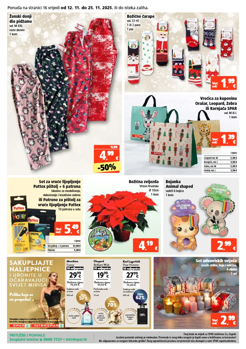 SAKUPL JA JTE NAL JEPNICE I U R O N I T E U O Č A R A V A J U Ć I S V I J E T M I R I S A Prilika koja se ne propušta! Sakupljajte naljepnice u razdoblju od 5.11.2025. do 6.1.2026. Iskoristite sakupljene naljepnice do 13.1.2026. ili do prodaje zaliha. UŠTEDA 57 % V R S T A M I R I S A voćni, cvjetni miris Toaletna voda za žene 100 ml Moschino Funny 29 99 10 naljepnica Redovna cijena 70,00 € € UŠTEDA 70 % V R S T A M I R I S A voćni, cvjetni, drvenasti miris Parfemska voda za žene 75 ml Chopard Brilliant Wish 19 99 10 naljepnica Redovna cijena 67,00 € € UŠTEDA 62 % V R S T A M I R I S A aromatični, fougere miris Toaletna voda za muškarce 100 ml Karl Lagerfeld Pour Homme 27 99 10 naljepnica Redovna cijena 75,00 € € Set za vruće lijepljenje Pattex pištolj + 6 patrona Idealno za modeliranje, dekoriranje i kreativne radove ili Patrone za pištolj za vruće lijepljenje Pattex 10 patrona u setu Božićna zvijezda Vrtovi Hrvatske Ø 10cm 1 kom Bojanka Animal shaped sadrži 6 bojica 1 kom Ženski donji dio pidžame vel. M-XXL razni dezeni 1 kom Božićne čarape vel. 37-41 1 ili 2 para 1 par -50% -50% 9,99 € 4 , 99 99 € 2 , 99 99 € 4 , 1 19 9 Već od: € 1 , 99 99 Već od: € 5 , 49 49 Već od: € 1 , 39 39 Već od: € 2 , 99 99 Cijena Set pištolj + 6 patrona 12,99 € Patrone 5,49 € Vrećica za kupovinu Orašar, Leopard, Zebra ili Kornjača SPAR vel. M ili L 1 kom Cijena Leopard vel. M 1,39 € Kornjača, vel. L 1,59 € Zebra, vel. M 1,39 € Orašar, vel. L 1,59 € Set adventskih svijeća raznih oblika, boja i veličina, 4-dijelni 1 set PRITUÆBE I POHVALE: besplatni telefon 0800 7727 • info@spar.hr Ovaj letak ne vrijedi za SPAR Jurišićeva 2a, Zagreb. Izraženi postotak sniženja je minimalan. Proizvode iz ovog letka moguće je kupiti samo u količinama za kućanstvo! Ne odgovaramo za moguće tiskarske greške! Zbog ograničenosti prostora svi proizvodi nisu dostupni u svim SPAR supermarketima. Ponuda na stranici 16 vrijedi od 12. 11. do 25. 11. 2025. ili do isteka zaliha.