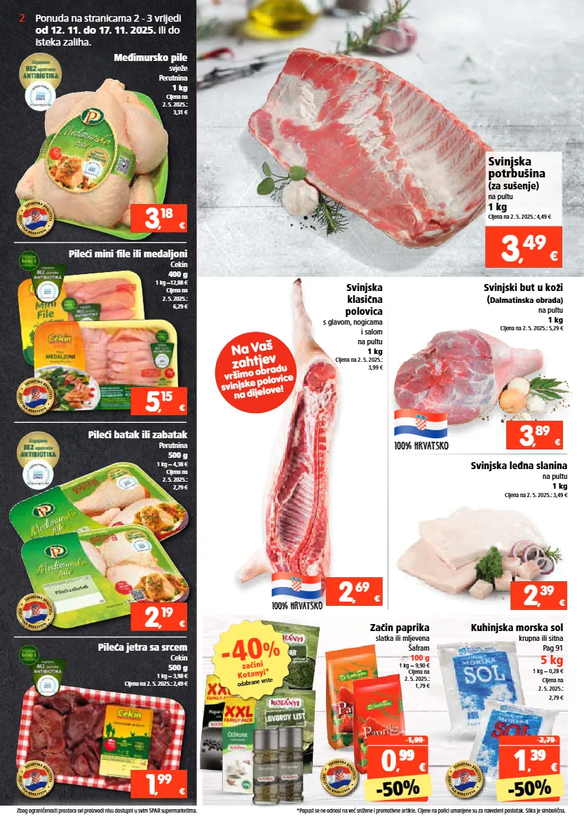kuhinjska morska sol krupna ili sitna pag 91 5 kg 1 kg = 0,28 € cijena na 2. 5. 2025.: 2,79 € -40 % začini kotanyi* odabrane vrste 100% hrvatsko 100% hrvatsko na vaš zahtjev vršimo obradu svinjske polovice na dijelove! svinjska potrbušina (za sušenje) na pultu 1 kg cijena na 2. 5. 2025.: 4,49 € 3 , 49 € međimursko pile svježe perutnina 1 kg cijena na 2. 5. 2025.: 3,31 € pileći mini file ili medaljoni cekin 400 g 1 kg =12,88 € cijena na 2. 5. 2025.: 6,29 € € 3 , 18 € 5 , 15 pileći batak ili zabatak perutnina 500 g 1 kg = 4,38 € cijena na 2. 5. 2025.: 2,79 € pileća jetra sa srcem cekin 500 g 1 kg = 3,98 € cijena na 2. 5. 2025.: 2,49 € € 2 , 19 € 1 , 99 svinjski but u koži ( dalmatinska obrada) na pultu 1 kg cijena na 2. 5. 2025.: 5,29 € svinjska klasična polovica s glavom, nogicama i salom na pultu 1 kg cijena na 2. 5. 2025.: 3,99 € svinjska leđna slanina na pultu 1 kg cijena na 2. 5. 2025.: 3,49 € € 3 , 89 € 2 , 69 € 2 , 39 h r v a t s k a k v a l i t e t a h r v a t s k a k v a l i t e t a h r v a t s k a k v a l i t e t a h r v a t s k a k v a l i t e t a h r v a t s k a k v a l i t e t a h r v a t s k a k v a l i t e t a h r v a t s k a k v a l i t e t a h r v a t s k a k v a l i t e t a h r v a t s k a k v a l i t e t a h r v a t s k a k v a l i t e t a h r v a t s k a k v a l i t e t a h r v a t s k a k v a l i t e t a začin paprika slatka ili mljevena šafram 100 g 1 kg = 9,90 € cijena na 2. 5. 2025.: 1,79 € -50% -50% 2,79 € 1 , 39 39 -50% -50% 1,99 € 0 , 99 99 2 zbog ograničenosti prostora svi proizvodi nisu dostupni u svim spar supermarketima. ponuda na stranicama 2 - 3 vrijedi od 12. 11. do 17. 11. 2025. ili do isteka zaliha. *popust se ne odnosi na već snižene i promotivne artikle. cijene na polici umanjene su za navedeni postotak. slika je simbolična.