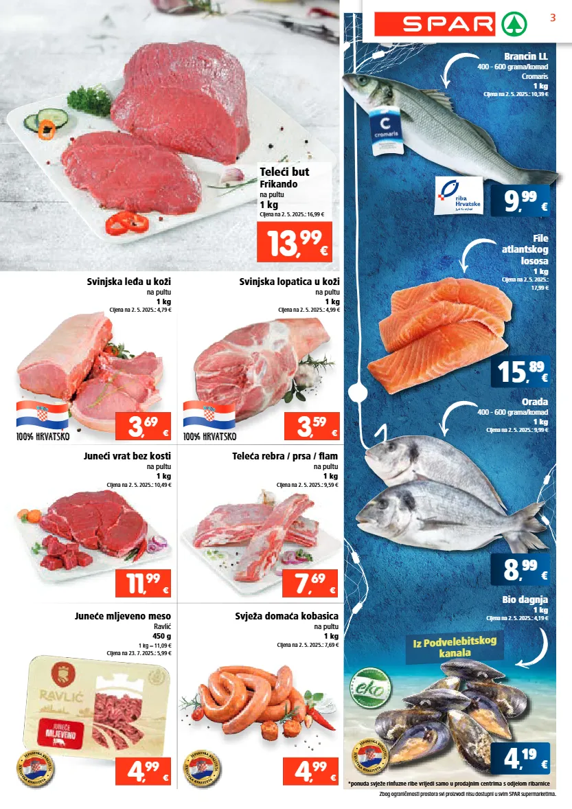 100% hrvatsko 100% hrvatsko teleći but frikando na pultu 1 kg cijena na 2. 5. 2025.: 16,99 € 13 , 99 € svinjska lopatica u koži na pultu 1 kg cijena na 2. 5. 2025.: 4,99 € svinjska leđa u koži na pultu 1 kg cijena na 2. 5. 2025.: 4,79 € juneći vrat bez kosti na pultu 1 kg cijena na 2. 5. 2025.: 10,49 € juneće mljeveno meso ravlić 450 g 1 kg = 11,09 € cijena na 23. 7. 2025.: 5,99 € teleća rebra / prsa / flam na pultu 1 kg cijena na 2. 5. 2025.: 9,59 € svježa domaća kobasica na pultu 1 kg cijena na 2. 5. 2025.: 7,69 € € 3 , 59 € 3 , 69 € 11 , 99 € 4 , 99 € 7 , 69 € 4 , 99 file atlantskog lososa 1 kg cijena na 2. 5. 2025.: 17,99 € € 15 , 89 89 brancin ll 400 - 600 grama/komad cromaris 1 kg cijena na 2. 5. 2025.: 10,39 € € 9 , 99 99 orada 400 - 600 grama/komad 1 kg cijena na 2. 5. 2025.: 9,99 € € 8 , 99 99 bio dagnja 1 kg cijena na 2. 5. 2025.: 4,19 € € 4 , 19 19 h r v a t s k a k v a l i t e t a h r v a t s k a k v a l i t e t a h r v a t s k a k v a l i t e t a h r v a t s k a k v a l i t e t a h r v a t s k a k v a l i t e t a h r v a t s k a k v a l i t e t a iz podvelebitskog kanala *ponuda svježe rinfuzne ribe vrijedi samo u prodajnim centrima s odjelom ribarnice 3 zbog ograničenosti prostora svi proizvodi nisu dostupni u svim spar supermarketima.