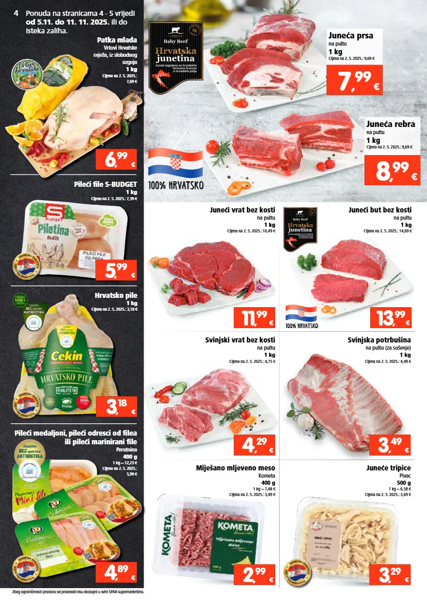 juneća rebra na pultu 1 kg cijena na 2. 5. 2025.: 9,69 € 8 , 99 € juneća prsa na pultu 1 kg cijena na 2. 5. 2025.: 9,69 € 7 , 99 € patka mlada vrtovi hrvatske svježa, iz slobodnog uzgoja 1 kg cijena na 2. 5. 2025.: 7,69 € pileći file s-budget 1 kg cijena na 2. 5. 2025.: 7,39 € € 6 , 99 € 5 , 99 hrvatsko pile 1 kg cijena na 2. 5. 2025.: 3,18 € pileći medaljoni, pileći odresci od filea ili pileći marinirani file perutnina 400 g 1 kg = 12,23 € cijena na 2. 5. 2025.: 5,99 € € 3 , 18 € 4 , 89 juneći but bez kosti na pultu 1 kg cijena na 2. 5. 2025.: 14,69 € juneći vrat bez kosti na pultu 1 kg cijena na 2. 5. 2025.: 10,49 € svinjski vrat bez kosti na pultu 1 kg cijena na 2. 5. 2025.: 4,75 € miješano mljeveno meso kometa 400 g 1 kg = 7,48 € cijena na 2. 5. 2025.: 3,49 € svinjska potrbušina na pultu (za sušenje) 1 kg cijena na 2. 5. 2025.: 4,49 € juneće tripice pivac 500 g 1 kg = 6,58 € cijena na 2. 5. 2025.: 3,69 € € 13 , 99 € 11 , 99 € 4 , 29 € 2 , 99 € 3 , 49 € 3 , 29 h r v a t s k a k v a l i t e t a h r v a t s k a k v a l i t e t a 100% hrvatsko 100% hrvatsko h r v a t s k a k v a l i t e t a h r v a t s k a k v a l i t e t a h r v a t s k a k v a l i t e t a h r v a t s k a k v a l i t e t a h r v a t s k a k v a l i t e t a h r v a t s k a k v a l i t e t a zbog ograničenosti prostora svi proizvodi nisu dostupni u svim spar supermarketima. 4 ponuda na stranicama 4 - 5 vrijedi od 5.11. do 11. 11. 2025. ili do isteka zaliha.