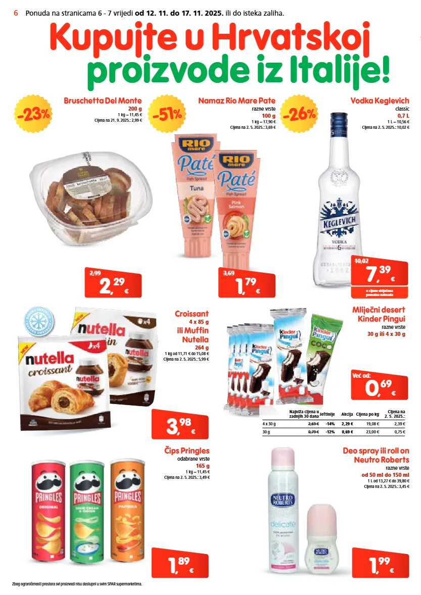 bruschetta del monte 200 g 1 kg = 11,45 € cijena na 21. 9. 2025.: 2,99 € namaz rio mare pate razne vrste 100 g 1 kg = 17,90 € cijena na 2. 5. 2025.: 3,69 € vodka keglevich classic 0,7 l 1 l = 10,56 € cijena na 2. 5. 2025.: 10,02 € croissant 4 x 85 g ili muffin nutella 264 g 1 kg od 11,71 € do 15,08 € cijena na 2. 5. 2025.: 5,99 € mliječni desert kinder pingui razne vrste 30 g ili 4 x 30 g 1 , 89 € 1 , 99 € 3 , 98 € 0 , 69 € već od: 2 , 29 € 2,99 1 , 79 € 3,69 7 , 39 € 10,02 čips pringles odabrane vrste 165 g 1 kg = 11,45 € cijena na 2. 5. 2025.: 3,49 € -23 % -51 % -26 % najniža cijena u zadnjih 30 dana jeftinije akcija cijena po kg cijena na 2. 5. 2025.: 4 x 30 g 2,69 € -14% 2,29 € 19,08 € 2,39 € 30 g 0,79 € -12% 0,69 € 23,00 € 0,75 € u cijenu uključena povratna naknada deo spray ili roll on neutro roberts razne vrste od 50 ml do 150 ml 1 l od 13,27 € do 39,80 € cijena na 2. 5. 2025.: 3,45 € 6 ponuda na stranicama 6 - 7 vrijedi od 12. 11. do 17. 11. 2025. ili do isteka zaliha. zbog ograničenosti prostora svi proizvodi nisu dostupni u svim spar supermarketima. kupujte u hrvatskoj proizvode iz italije!