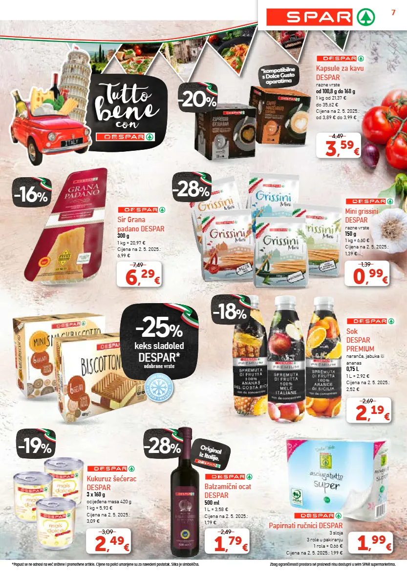 € 1 , 99 balzamični ocat despar 500 ml 1 l = 3,58 € cijena na 2. 5. 2025.: 1,79 € sok despar premium naranča, jabuka ili ananas 0,75 l 1 l = 2,92 € cijena na 2. 5. 2025.: 2,52 € 2,69 € 2 , 19 2,49 € 1 , 79 - 18 % - 28 % - 16 % - 28 % - 19 % - 20 % kapsule za kavu despar razne vrste od 100,8 g do 168 g 1 kg od 21,37 € do 35,62 € cijena na 2. 5. 2025.: od 3,89 € do 3,99 € 4,49 € 3 , 59 sir grana padano despar 300 g 1 kg = 20,97 € cijena na 2. 5. 2025.: 6,99 € mini grissini despar razne vrste 150 g 1 kg = 6,60 € cijena na 2. 5. 2025.: 1,39 € kukuruz šećerac despar 3 x 160 g ocijeđena masa 420 g 1 kg = 5,93 € cijena na 2. 5. 2025.: 3,09 € 3,09 € 2 , 49 7,49 € 6 , 29 1,39 € 0, 99 papirnati ručnici despar 3 sloja 3 role u pakiranju 1 rola = 0,66 € cijena na 2. 5. 2025.: 1,99 € *kompatibilne s dolce gusto aparatima - 25 % keks sladoled despar* odabrane vrste original iz italije. 7 zbog ograničenosti prostora svi proizvodi nisu dostupni u svim spar supermarketima. 7 *popust se ne odnosi na već snižene i promotivne artikle. cijene na polici umanjene su za navedeni postotak. slika je simbolična.