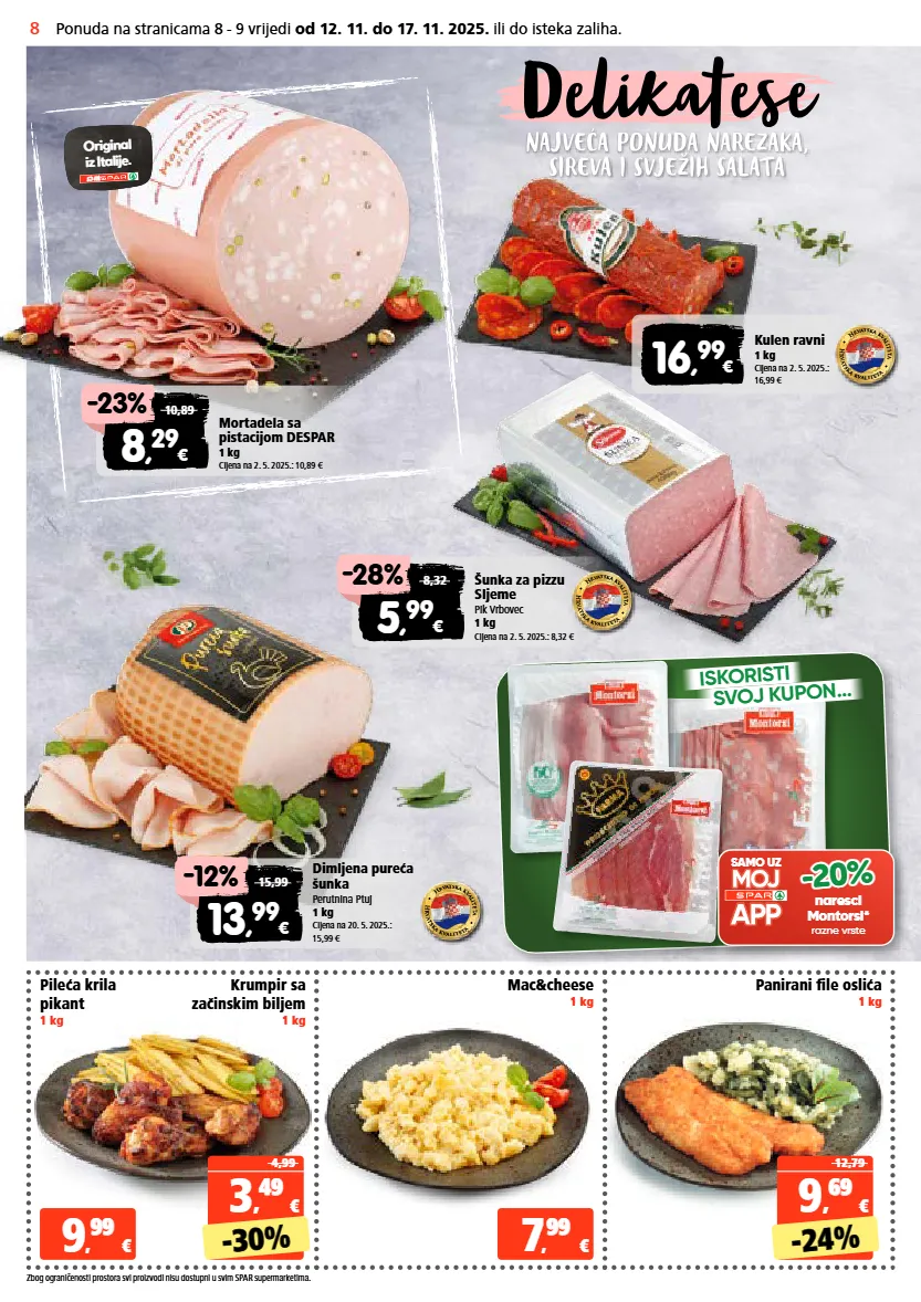 -30% -30% 4,99 € 3 , 49 49 -24% -24% 12,79 € 9 , 69 69 € 7 , 99 99 € 9 , 99 99 dimljena pureća šunka perutnina ptuj 1 kg cijena na 20. 5. 2025.: 15,99 € 15,99 13 , 99 € -12% mortadela sa pistacijom despar 1 kg cijena na 2. 5. 2025.: 10,89 € 10,89 8 , 29 € -23% 16 , 99 € kulen ravni 1 kg cijena na 2. 5. 2025.: 16,99 € pileća krila pikant 1 kg krumpir sa začinskim biljem 1 kg mac&cheese 1 kg panirani file oslića 1 kg šunka za pizzu sljeme pik vrbovec 1 kg cijena na 2. 5. 2025.: 8,32 € 8,32 5 , 99 € -28% h r v a t s k a k v a l i t e t a h r v a t s k a k v a l i t e t a original iz italije. samo uz -20% -20% naresci montorsi* razne vrste iskoristi svoj kupon... h r v a t s k a k v a l i t e t a h r v a t s k a k v a l i t e t a h r v a t s k a k v a l i t e t a h r v a t s k a k v a l i t e t a 8 ponuda na stranicama 8 - 9 vrijedi od 12. 11. do 17. 11. 2025. ili do isteka zaliha. zbog ograničenosti prostora svi proizvodi nisu dostupni u svim spar supermarketima.