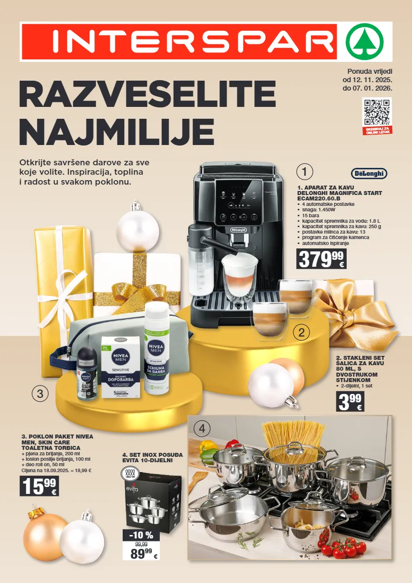 otkrijte savršene darove za sve koje volite. inspiracija, toplina i radost u svakom poklonu. razveselite najmilije 2 3 4 1. aparat za kavu delonghi magnifica start ecam220.60.b • 4 automatske postavke • snaga: 1.450w • 15 bara • kapacitet spremnika za vodu: 1.8 l • kapacitet spremnika za kavu: 250 g • postavke mlinca za kavu: 13 • program za čišćenje kamenca • automatsko ispiranje 4. set inox posuđa evita 10-dijelni 3. poklon paket nivea men, skin care toaletna torbica + pjena za brijanje, 200 ml + losion poslije brijanja, 100 ml + deo roll on, 50 ml cijena na 18.09.2025. = 18,99 € 1 379 99 € 15 99 € 3 99 € -10 % 89 99 99,99 € 2. stakleni set šalica za kavu 80 ml, s dvostrukom stijenkom • 2-dijelni, 1 set ponuda vrijedi od 12. 11. 2025. do 07. 01. 2026. skeniraj za online letak