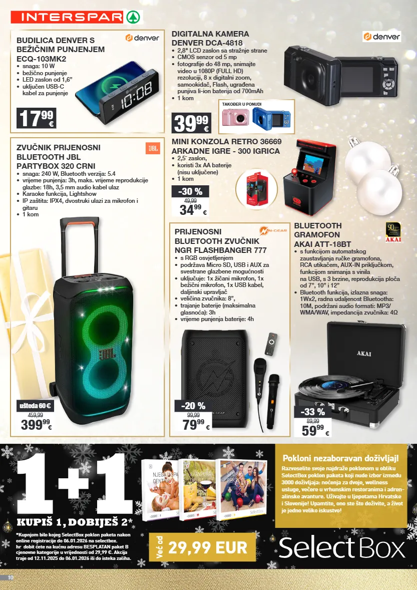 *kupnjom bilo kojeg selectbox poklon paketa nakon online registracije do 06.01.2026 na selectbox. hr dobit ćete na kućnu adresu besplatan paket b cjenovne kategorije u vrijednosti od 29,99 €. akcija traje od 12.11.2025 do 06.01.2026 ili do isteka zaliha. već od 29,99 eur pokloni nezaboravan doživljaj! razveselite svoje najdraže poklonom u obliku selectbox poklon paketa koji nude izbor između 3000 doživljaja: noćenja za dvoje, wellness usluge, večere u vrhunskim restoranima i adren- alinske avanture. uživajte u ljepotama hrvatske i slovenije! upamtite, ono ste što doživite, a život je jedno veliko iskustvo! budilica denver s bežičnim punjenjem ecq-103mk2 • snaga: 10 w • bežično punjenje • led zaslon od 1,6” • uključen usb-c kabel za punjenje prijenosni bluetooth zvučnik ngr flashbanger 777 • s rgb osvjetljenjem • podržava micro sd, usb i aux za svestrane glazbene mogućnosti • uključuje: 1x žičani mikrofon, 1x bežični mikrofon, 1x usb kabel, daljinski upravljač • veličina zvučnika: 8”, • trajanje baterije (maksimalna glasnoća): 3h • vrijeme punjenja baterije: 4h zvučnik prijenosni bluetooth jbl partybox 320 crni • snaga: 240 w, bluetooth verzija: 5.4 • vrijeme punjenja: 3h, maks. vrijeme reprodukcije glazbe: 18h, 3,5 mm audio kabel ulaz • karaoke funkcija, lightshow • ip zaštita: ipx4, dvostruki ulazi za mikrofon i gitaru • 1 kom bluetooth gramofon akai att-18bt • s funkcijom automatskog zaustavljanja ručke gramofona, rca utikačem, aux-in priključkom, funkcijom snimanja s vinila na usb, s 3 brzine, reprodukcija ploča od 7”, 10” i 12” • bluetooth funkcija, izlazna snaga: 1wx2, radna udaljenost bluetootha: 10m, podržani audio formati: mp3/ wma/wav, impedancija zvučnika: 4ω mini konzola retro 36669 arkadne igre - 300 igrica • 2,5¨ zaslon, • koristi 3x aa baterije (nisu uključene) • 1 kom 17 99 € -20 % 79 99 99,99 € -30 % 34 99 49,99 € također u ponudi -33 % 59 99 89,99 € 39 99 € 399 99 € 459,99 ušteda 60 € digitalna kamera denver dca-4818 • 2,8" lcd zaslon sa stražnje strane • cmos senzor od 5 mp • fotografije do 48 mp, snimajte video u 1080p (full hd) rezoluciji, 8 x digitalni zoom, samookidač, flash, ugrađena punjiva li-ion baterija od 700mah • 1 kom 10