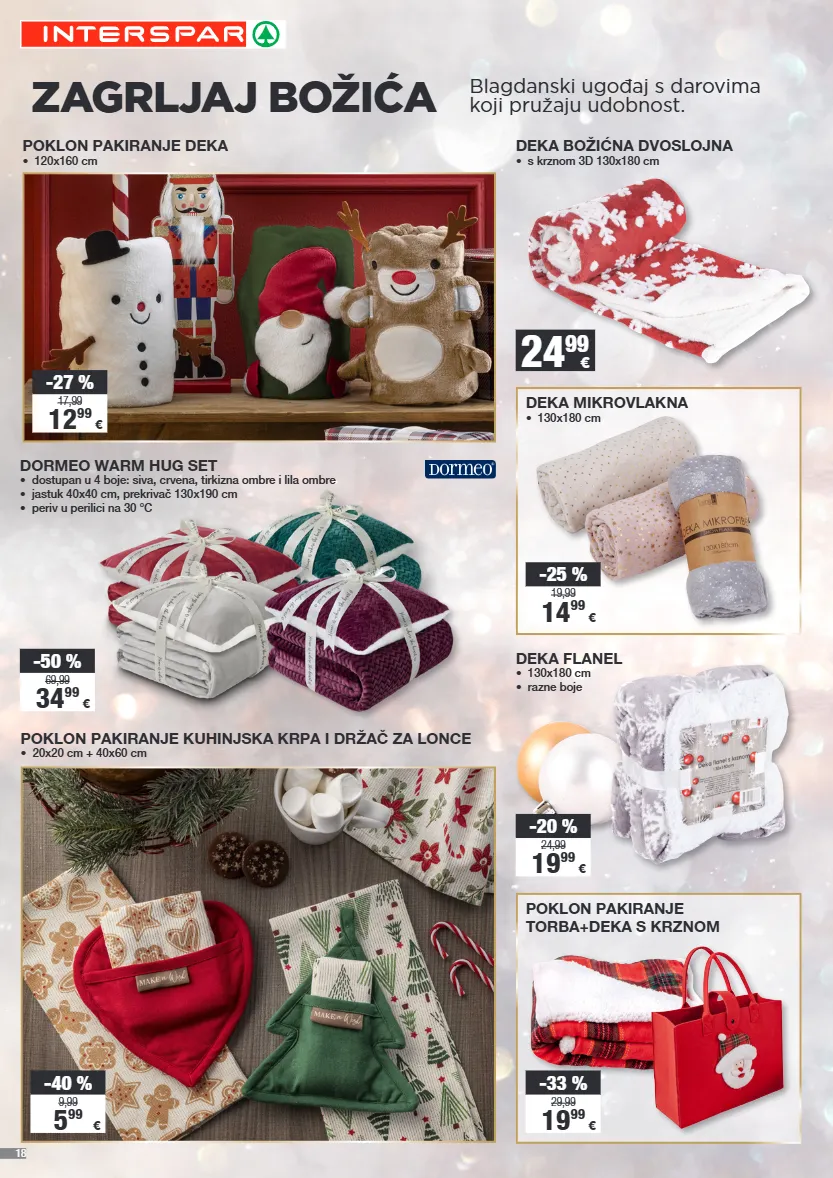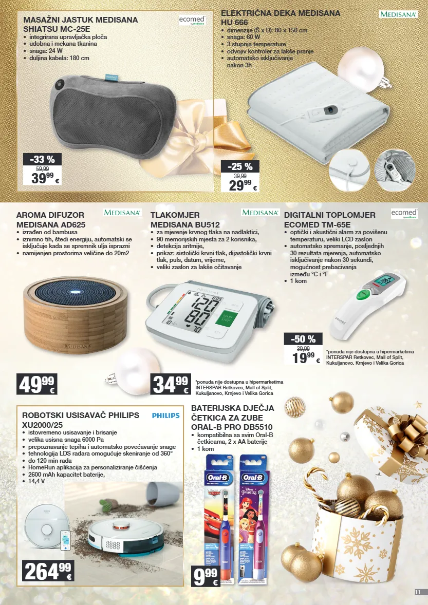 *ponuda nije dostupna u hipermarketima interspar retkovec, mall of split, kukuljanovo, krnjevo i velika gorica masažni jastuk medisana shiatsu mc-25e • integrirana upravljačka ploča • udobna i mekana tkanina • snaga: 24 w • duljina kabela: 180 cm električna deka medisana hu 666 • dimenzije (š x d): 80 x 150 cm • snaga: 60 w • 3 stupnja temperature • odvojiv kontroler za lakše pranje • automatsko isključivanje nakon 3h aroma difuzor medisana ad625 • izrađen od bambusa • iznimno tih, štedi energiju, automatski se isključuje kada se spremnik ulja isprazni • namijenjen prostorima veličine do 20m2 tlakomjer medisana bu512 • za mjerenje krvnog tlaka na nadlaktici, • 90 memorijskih mjesta za 2 korisnika, • detekcija aritmije, • prikaz: sistolički krvni tlak, dijastolički krvni tlak, puls, datum, vrijeme, • veliki zaslon za lakše očitavanje digitalni toplomjer ecomed tm-65e • optički i akustični alarm za povišenu temperaturu, veliki lcd zaslon • automatsko spremanje, posljednjih 30 rezultata mjerenja, automatsko isključivanje nakon 30 sekundi, mogućnost prebacivanja između °c i °f • 1 kom robotski usisavač philips xu2000/25 • istovremeno usisavanje i brisanje • velika usisna snaga 6000 pa • prepoznavanje tepiha i automatsko povećavanje snage • tehnologija lds radara omogućuje skeniranje od 360° • do 120 min rada • homerun aplikacija za personaliziranje čišćenja • 2600 mah kapacitet baterije, • 14,4 v -33 % 39 99 59,99 € -25 % 29 99 39,99 € 49 99 € 34 99 € -50 % 19 99 39,99 € *ponuda nije dostupna u hipermarketima interspar retkovec, mall of split, kukuljanovo, krnjevo i velika gorica 264 99 € 9 99 € baterijska dječja četkica za zube oral-b pro db5510 • kompatibilna sa svim oral-b četkicama, 2 x aa baterije • 1 kom 11