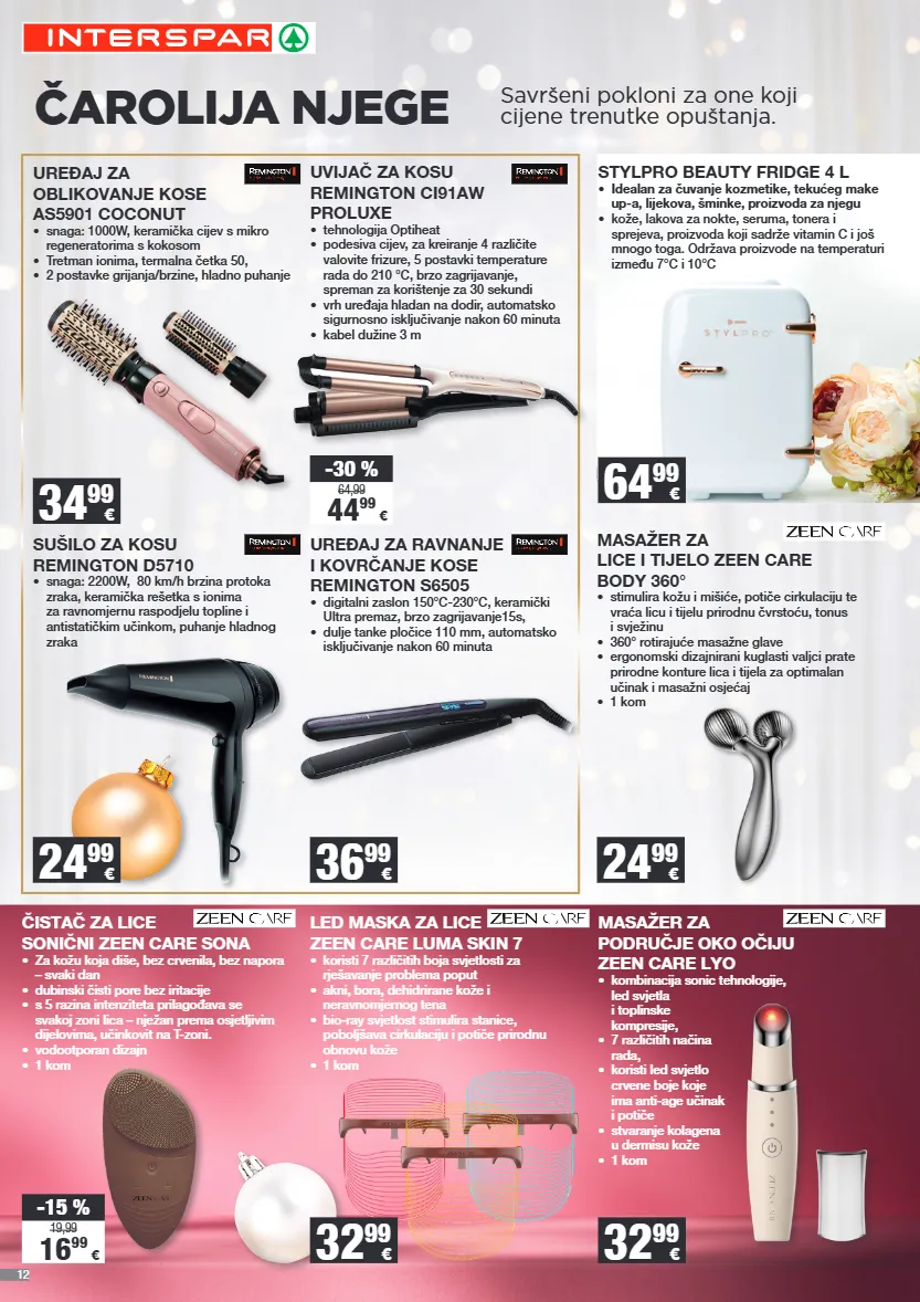 34 99 € 24 99 € čarolija njege savršeni pokloni za one koji cijene trenutke opuštanja. -30 % 44 99 64,99 € uređaj za oblikovanje kose as5901 coconut • snaga: 1000w, keramička cijev s mikro regeneratorima s kokosom • tretman ionima, termalna četka 50, • 2 postavke grijanja/brzine, hladno puhanje sušilo za kosu remington d5710 • snaga: 2200w, 80 km/h brzina protoka zraka, keramička rešetka s ionima za ravnomjernu raspodjelu topline i antistatičkim učinkom, puhanje hladnog zraka led maska za lice zeen care luma skin 7 • koristi 7 različitih boja svjetlosti za rješavanje problema poput • akni, bora, dehidrirane kože i neravnomjernog tena • bio-ray svjetlost stimulira stanice, poboljšava cirkulaciju i potiče prirodnu obnovu kože • 1 kom masažer za područje oko očiju zeen care lyo • kombinacija sonic tehnologije, led svjetla i toplinske kompresije, • 7 različitih načina rada, • koristi led svjetlo crvene boje koje ima anti-age učinak i potiče • stvaranje kolagena u dermisu kože • 1 kom čistač za lice sonični zeen care sona • za kožu koja diše, bez crvenila, bez napora – svaki dan • dubinski čisti pore bez iritacije • s 5 razina intenziteta prilagođava se svakoj zoni lica – nježan prema osjetljivim dijelovima, učinkovit na t-zoni. • vodootporan dizajn • 1 kom uređaj za ravnanje i kovrčanje kose remington s6505 • digitalni zaslon 150°c-230°c, keramički ultra premaz, brzo zagrijavanje15s, • dulje tanke pločice 110 mm, automatsko isključivanje nakon 60 minuta uvijač za kosu remington ci91aw proluxe • tehnologija optiheat • podesiva cijev, za kreiranje 4 različite valovite frizure, 5 postavki temperature rada do 210 °c, brzo zagrijavanje, spreman za korištenje za 30 sekundi • vrh uređaja hladan na dodir, automatsko sigurnosno isključivanje nakon 60 minuta • kabel dužine 3 m 36 99 € 24 99 € 32 99 € 32 99 € stylpro beauty fridge 4 l • idealan za čuvanje kozmetike, tekućeg make up-a, lijekova, šminke, proizvoda za njegu • kože, lakova za nokte, seruma, tonera i sprejeva, proizvoda koji sadrže vitamin c i još mnogo toga. održava proizvode na temperaturi između 7°c i 10°c 64 99 € masažer za lice i tijelo zeen care body 360° • stimulira kožu i mišiće, potiče cirkulaciju te vraća licu i tijelu prirodnu čvrstoću, tonus i svježinu • 360° rotirajuće masažne glave • ergonomski dizajnirani kuglasti valjci prate prirodne konture lica i tijela za optimalan učinak i masažni osjećaj • 1 kom -15 % 16 99 19,99 € 12