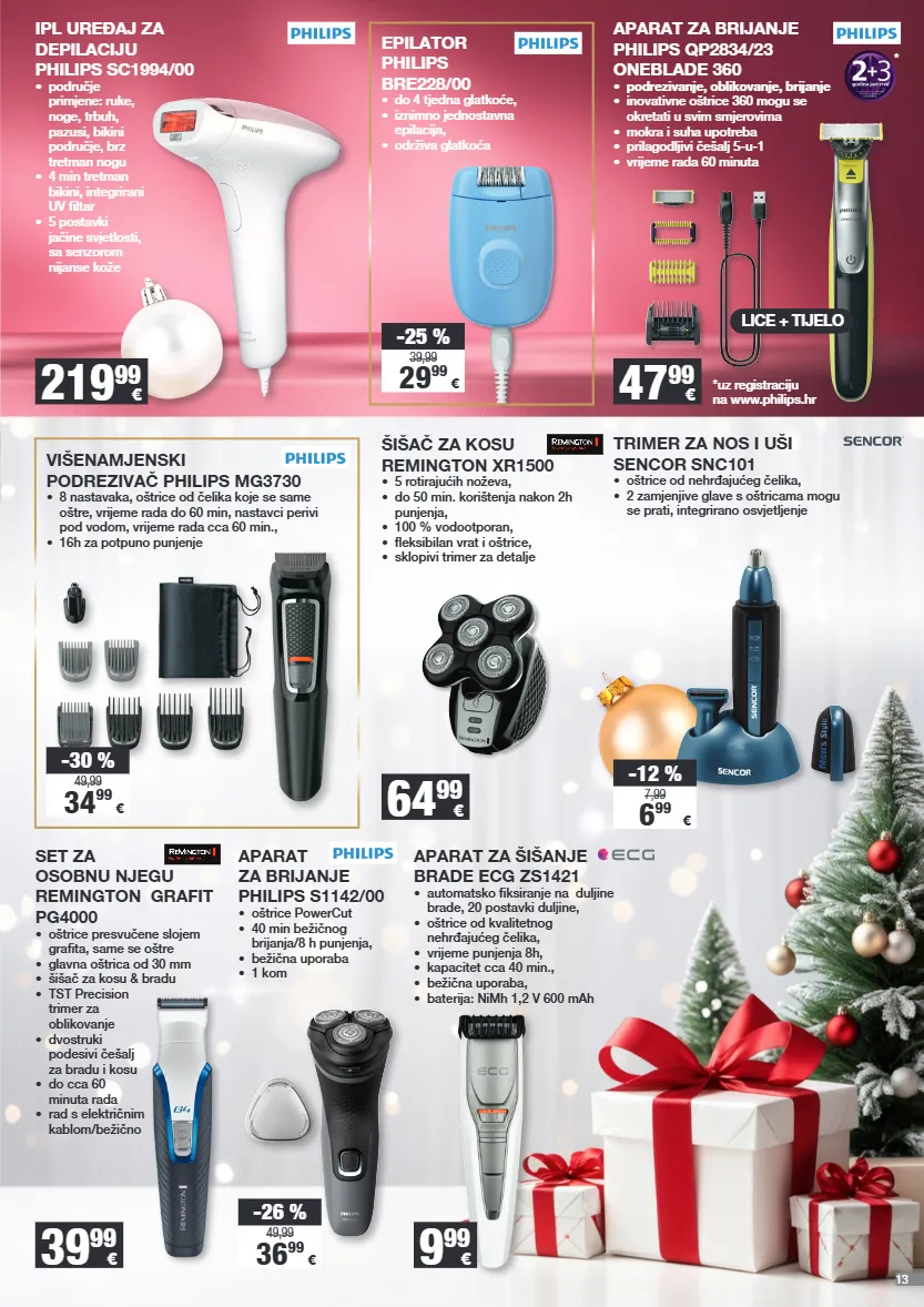 -30 % 34 99 49,99 € -12 % 6 99 7,99 € -26 % 36 99 49,99 € ipl uređaj za depilaciju philips sc1994/00 • područje primjene: ruke, noge, trbuh, pazusi, bikini područje, brz tretman nogu • 4 min tretman bikini, integrirani uv filtar • 5 postavki jačine svjetlosti, sa senzorom nijanse kože višenamjenski podrezivač philips mg3730 • 8 nastavaka, oštrice od čelika koje se same oštre, vrijeme rada do 60 min, nastavci perivi pod vodom, vrijeme rada cca 60 min., • 16h za potpuno punjenje trimer za nos i uši sencor snc101 • oštrice od nehrđajućeg čelika, • 2 zamjenjive glave s oštricama mogu se prati, integrirano osvjetljenje aparat za brijanje philips s1142/00 • oštrice powercut • 40 min bežičnog brijanja/8 h punjenja, • bežična uporaba • 1 kom aparat za šišanje brade ecg zs1421 • automatsko fiksiranje na duljine brade, 20 postavki duljine, • oštrice od kvalitetnog nehrđajućeg čelika, • vrijeme punjenja 8h, • kapacitet cca 40 min., • bežična uporaba, • baterija: nimh 1,2 v 600 mah epilator philips bre228/00 • do 4 tjedna glatkoće, • iznimno jednostavna epilacija, • održiva glatkoća šišač za kosu remington xr1500 • 5 rotirajućih noževa, • do 50 min. korištenja nakon 2h punjenja, • 100 % vodootporan, • fleksibilan vrat i oštrice, • sklopivi trimer za detalje set za osobnu njegu remington grafit pg4000 • oštrice presvučene slojem grafita, same se oštre • glavna oštrica od 30 mm • šišač za kosu & bradu • tst precision trimer za oblikovanje • dvostruki podesivi češalj za bradu i kosu • do cca 60 minuta rada • rad s električnim kablom/bežično 64 99 € 39 99 € 219 99 € aparat za brijanje philips qp2834/23 oneblade 360 • podrezivanje, oblikovanje, brijanje • inovativne oštrice 360 mogu se okretati u svim smjerovima • mokra i suha upotreba • prilagodljivi češalj 5-u-1 • vrijeme rada 60 minuta 47 99 € lice + tijelo *uz registraciju na www.philips.hr * 9 99 € -25 % 29 99 39,99 € 13