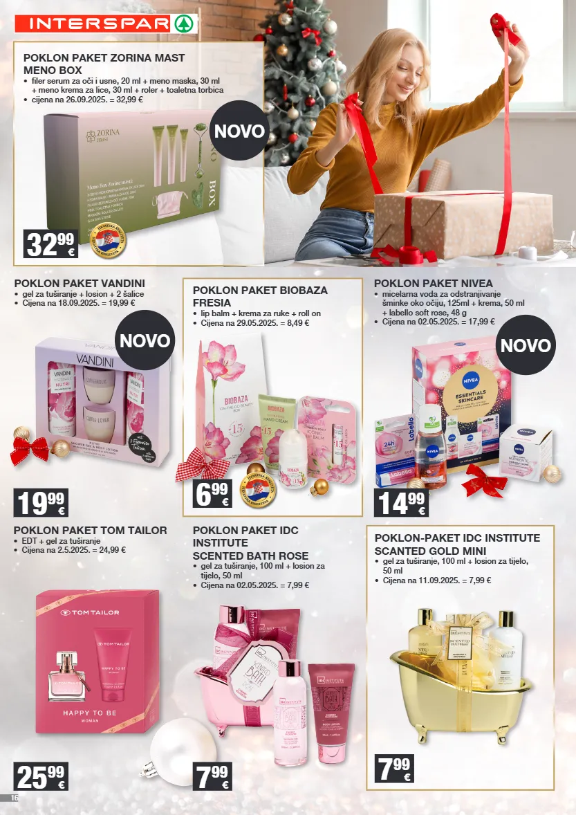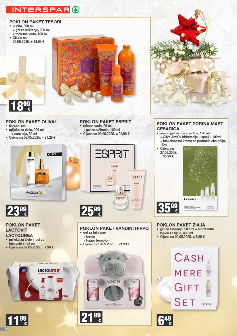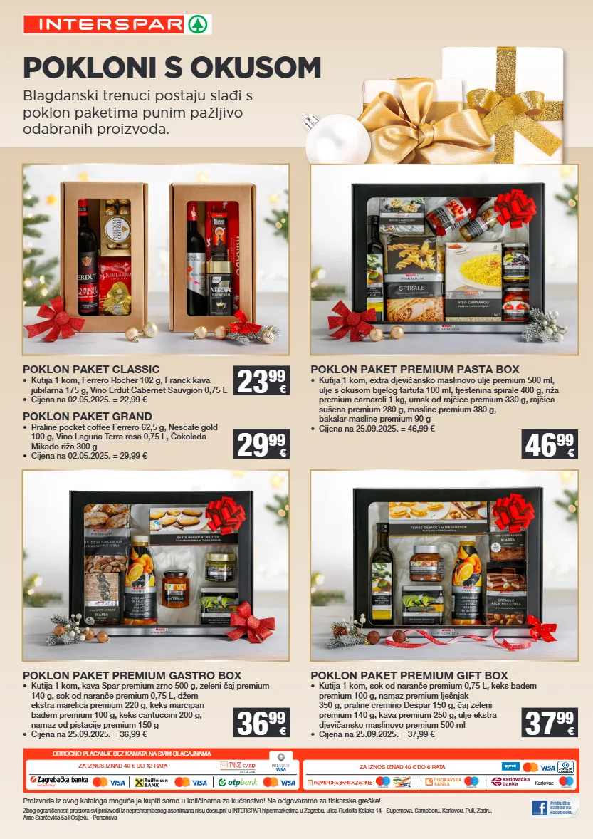 poklon paket classic • kutija 1 kom, ferrero rocher 102 g, franck kava jubilarna 175 g, vino erdut cabernet sauvgion 0,75 l • cijena na 02.05.2025. = 22,99 € 23 99 € poklon paket grand • praline pocket coffee ferrero 62,5 g, nescafe gold 100 g, vino laguna terra rosa 0,75 l, čokolada mikado riža 300 g • cijena na 02.05.2025. = 29,99 € 29 99 € poklon paket premium pasta box • kutija 1 kom, extra djevičansko maslinovo ulje premium 500 ml, ulje s okusom bijelog tartufa 100 ml, tjestenina spirale 400 g, riža premium carnaroli 1 kg, umak od rajčice premium 330 g, rajčica sušena premium 280 g, masline premium 380 g, bakalar masline premium 90 g • cijena na 25.09.2025. = 46,99 € 46 99 € poklon paket premium gastro box • kutija 1 kom, kava spar premium zrno 500 g, zeleni čaj premium 140 g, sok od naranče premium 0,75 l, džem ekstra marelica premium 220 g, keks marcipan badem premium 100 g, keks cantuccini 200 g, namaz od pistacije premium 150 g • cijena na 25.09.2025. = 36,99 € 36 99 € poklon paket premium gift box • kutija 1 kom, sok od naranče premium 0,75 l, keks badem premium 100 g, namaz premium lješnjak 350 g, praline cremino despar 150 g, čaj zeleni premium 140 g, kava premium 250 g, ulje ekstra djevičansko maslinovo premium 500 ml • cijena na 25.09.2025. = 37,99 € 37 99 € pokloni s okusom blagdanski trenuci postaju slađi s poklon paketima punim pažljivo odabranih proizvoda. proizvode iz ovog kataloga moguće je kupiti samo u količinama za kućanstvo! ne odgovaramo za tiskarske greške! zbog ograničenosti prostora svi proizvodi iz neprehrambenog asortimana nisu dostupni u interspar hipermarketima u zagrebu, ulica rudolfa kolaka 14 - supernova, samoboru, karlovcu, puli, zadru, ante starčevića 5a i osijeku - portanova obročno plaćanje bez kamata na svim blagajnama karlovac debit electronic use only 4574 vrijedi do valid thru kontakt centar tel. + 385 1 4891 333 molimo nalaznika ove kartice da ju uruči najbližoj poslovnici banke. ova kartica je vlasništvo privredne banke zagreb d.d. this card is the property of privredna banka zagreb d.d., radnička cesta 50, 10000 zagreb, croatia, and must be returned upon request. potpis authorized signature - not valid unless signed za iznos iznad 40 € do 12 rata za iznos iznad 40 € do 6 rata pridružite nam se na facebooku pridružite