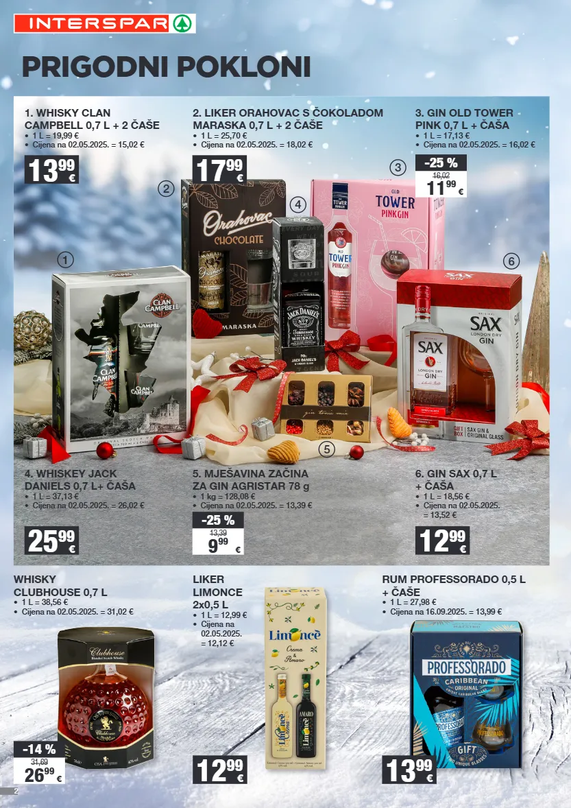 prigodni pokloni 4. whiskey jack daniels 0,7 l+ čaša • 1 l = 37,13 € • cijena na 02.05.2025. = 26,02 € 1. whisky clan campbell 0,7 l + 2 čaše • 1 l = 19,99 € • cijena na 02.05.2025. = 15,02 € whisky clubhouse 0,7 l • 1 l = 38,56 € • cijena na 02.05.2025. = 31,02 € 5. mješavina začina za gin agristar 78 g • 1 kg = 128,08 € • cijena na 02.05.2025. = 13,39 € 6. gin sax 0,7 l + čaša • 1 l = 18,56 € • cijena na 02.05.2025. = 13,52 € 3. gin old tower pink 0,7 l + čaša • 1 l = 17,13 € • cijena na 02.05.2025. = 16,02 € 2. liker orahovac s čokoladom maraska 0,7 l + 2 čaše • 1 l = 25,70 € • cijena na 02.05.2025. = 18,02 € liker limonce 2x0,5 l • 1 l = 12,99 € • cijena na 02.05.2025. = 12,12 € rum professorado 0,5 l + čaše • 1 l = 27,98 € • cijena na 16.09.2025. = 13,99 € -14 % 26 99 31,69 € -25 % 9 99 13,39 € -25 % 11 99 16,02 € 12 99 € 13 99 € 13 99 € 25 99 € 12 99 € 17 99 € 1 4 2 5 3 6 2