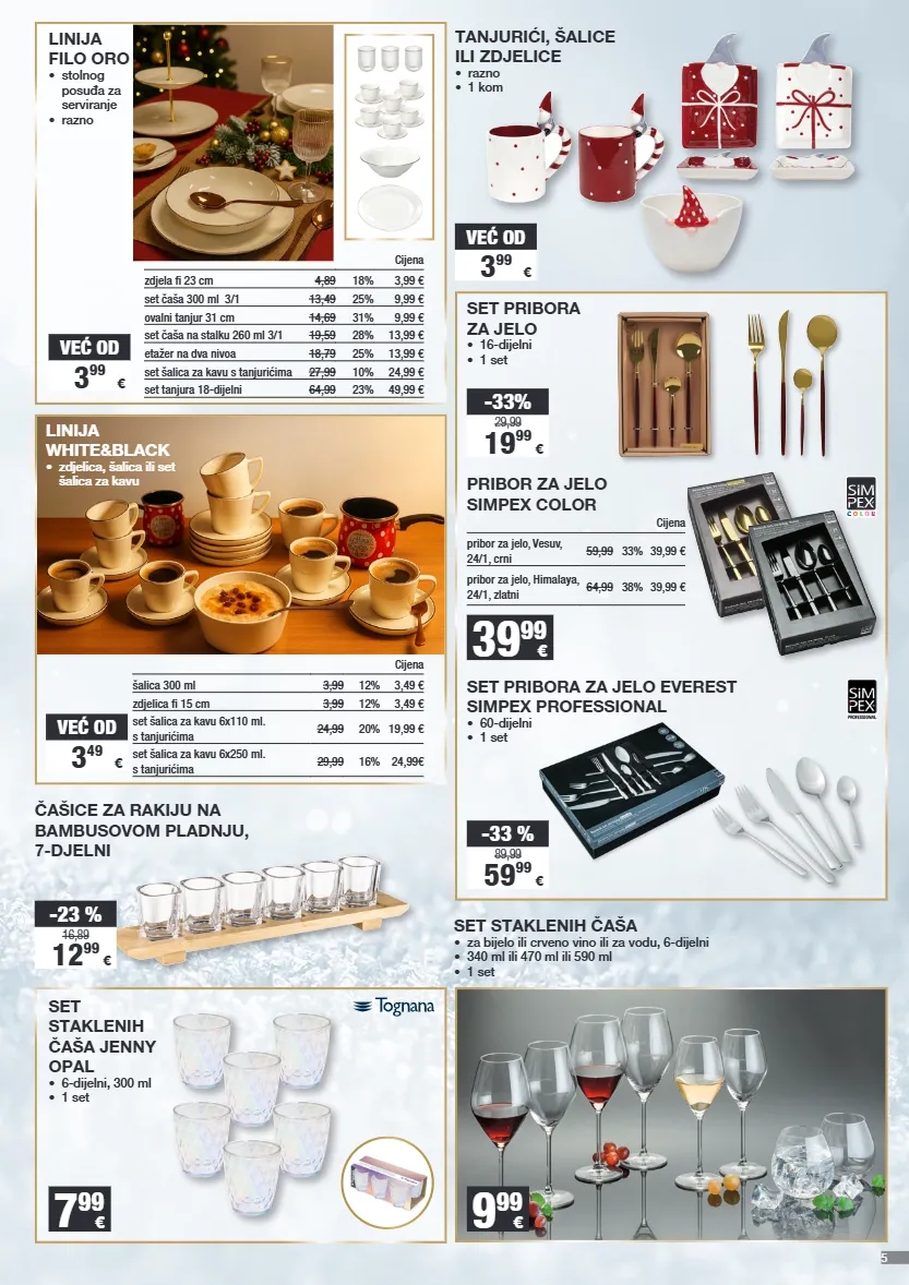 set staklenih čaša • za bijelo ili crveno vino ili za vodu, 6-dijelni • 340 ml ili 470 ml ili 590 ml • 1 set set pribora za jelo • 16-dijelni • 1 set -33% 19 99 29,99 € čašice za rakiju na bambusovom pladnju, 7-djelni -23 % 12 99 16,89 € linija filo oro • stolnog posuđa za serviranje • razno cijena zdjela fi 23 cm 4,89 18% 3,99 € set čaša 300 ml 3/1 13,49 25% 9,99 € ovalni tanjur 31 cm 14,69 31% 9,99 € set čaša na stalku 260 ml 3/1 19,59 28% 13,99 € etažer na dva nivoa 18,79 25% 13,99 € set šalica za kavu s tanjurićima 27,99 10% 24,99 € set tanjura 18-dijelni 64,99 23% 49,99 € 3 99 € već od pribor za jelo simpex color cijena pribor za jelo, vesuv, 24/1, crni 59,99 33% 39,99 € pribor za jelo, himalaya, 24/1, zlatni 64,99 38% 39,99 € 39 99 € tanjurići, šalice ili zdjelice • razno • 1 kom 3 99 € već od set pribora za jelo everest simpex professional • 60-dijelni • 1 set -33 % 59 99 89,99 € 3 49 € već od linija white&black • zdjelica, šalica ili set šalica za kavu cijena šalica 300 ml 3,99 12% 3,49 € zdjelica fi 15 cm 3,99 12% 3,49 € set šalica za kavu 6x110 ml. s tanjurićima 24,99 20% 19,99 € set šalica za kavu 6x250 ml. s tanjurićima 29,99 16% 24,99€ set staklenih čaša jenny opal • 6-dijelni, 300 ml • 1 set 9 99 € 7 99 € 5