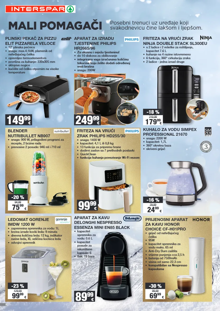 posebni trenuci uz uređaje koji svakodnevicu čine lakšom i ljepšom. mali pomagači plinski pekač za pizzu elit pizzarela veloce • 12¨ plinska pećnica • snaga: max.4.1kw, plamenik od nehrđajućeg čelika • opremljen termoelementom • površina za kuhanje: 330x305 mm • sklopive nogice • kućište od čelika otpornim na visoke temperature aparat za izradu tjestenine philips hr2665/96 • za ukusnu i svježu tjesteninu! • do 10 diskova za oblikovanje • integrirana vaga izračunava količinu tekućine koju želite dodati određenoj vrsti brašna • snaga: 200w blender nutribullet nb907 • snaga: 900 w, prilagođeni programi za recepte, 2 brzine rada • prenosive 2 posude: 946 ml i 710 ml ledomat gorenje imdw 1200 w • zapremnina spremnika za vodu: 1l • brzina izrade kocki leda: 9 minuta • dnevna količina leda: 12 kg, indikator razine leda, xl veličina kockica leda • odvojivi spremnik prijenosni aparat za kavu honor choice cf-h01pro • grijač od nehrđajućeg čelika • 95w • kapacitet spremnika za vodu maks. 65 ml • anti-dry burn zaštita • vrijeme punjenja cca 2,5 h • baterija od 7500mah • visina od samo 22.3 cm • kompatibilan sa nespresso kapsulama -20 % 75 99 94,99 € -23 % 99 99 129,99 € 149 99 € 249 99 € friteza na vrući zrak ninja double stack sl300eu • s 2 ladice i 2 rešetke za roštiljanje, kapacitet 7.6 l • kuhanje na 4 razine istovremeno • 6 funkcija, 360° cirkulaciju zraka • 2 ladice - jedna iznad druge -18 % 179 99 219,99 € friteza na vrući zrak philips hd255/30 • snaga: 1400 w • kapacitet: 4,1 l ili 0,8 kg • 13 funkcija za pripremu hrane • dodirni zaslon sa 7 prethodnih postavki • quickclean • funkcija kuhanja povezivanje wi-fi vezom 99 99 € aparat za kavu delonghi nespresso essenza mini en85 black • kapacitet spremnika za vodu: 0.6 l • kapacitet posude za iskorištene kapsule: 6 • tlak: 19 bara 89 99 € kuhalo za vodu simpex professional 21670 • snaga: 2200 w • kapacitet: 1,7l • 360° okretna baza • skriveni grijač -16 % 24 99 29,99 € -30 % 69 99 99,99 € 8