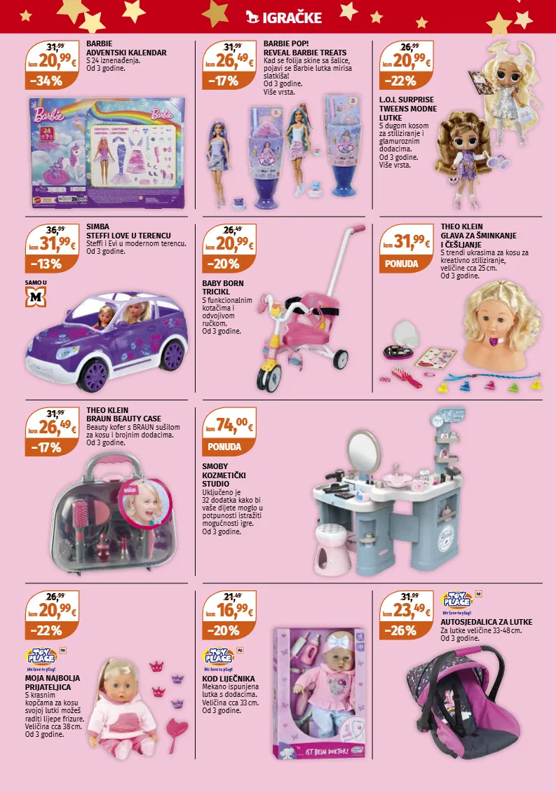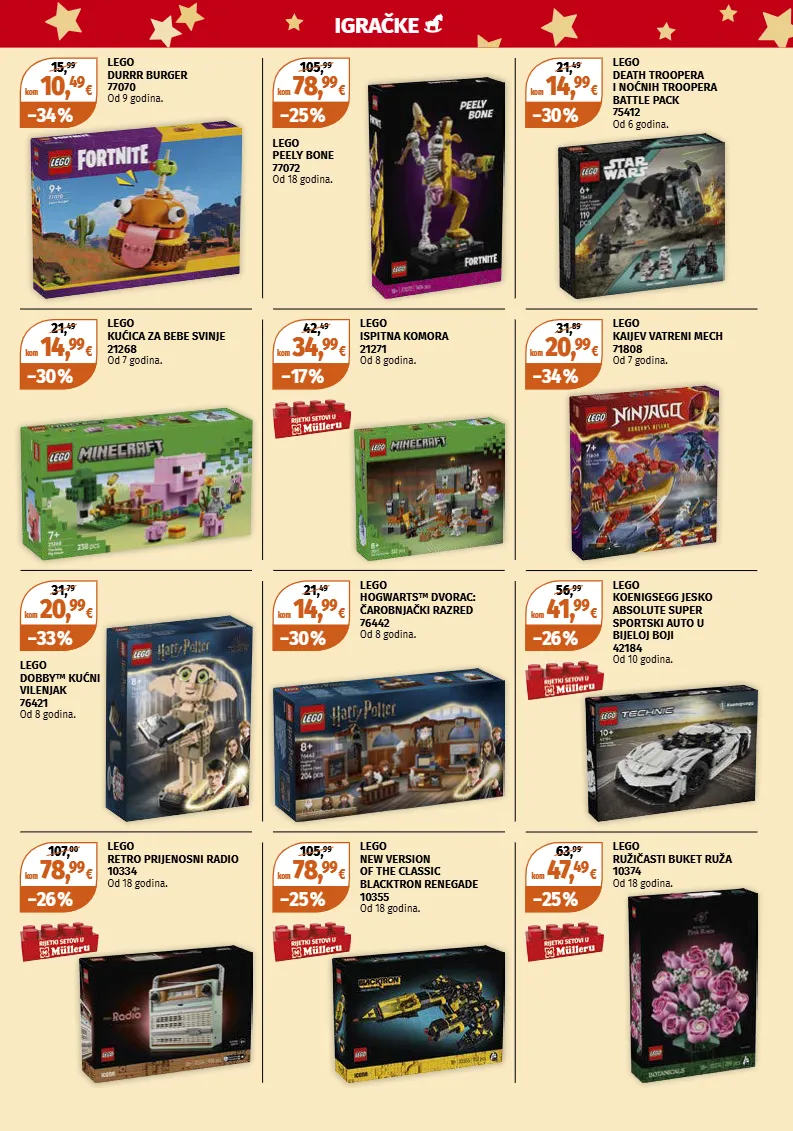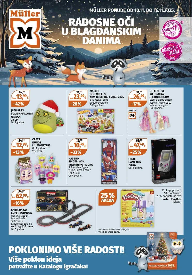 kom 62, 99 € − 16 % 74, 99 kom 47, 49 € − 25 % 63, 99 kom 23, 49 € − 26 % 31, 99 kom 10, 49 € − 33 % 15, 89 kom 12, 99 € − 13 % 14, 99 kom 26, 49 € − 17 % 31, 99 kom 13, 99 € − 42 % 24, 49 radosne oči u blagdanskim danima više poklon ideja potražite u katalogu igračaka! poklonimo više radosti! lego game boy 72046 od 18 godina. steffi love matovilka s jednorogom steffi s ekstra dugom kosom i jednorog sa svjetlećim rogom. od 3 godine. popust se obračunava na blagajni. vrijedi do isteka zaliha. carrera go super formula max verstappen i lando norris sudjeluju u uzbudljivoj utrci na stazi dugoj 5,3 metra. od 6 godina. mattel hot wheels adventski kalendar 2025 s 10 vozila i puno dodatne opreme. od 3 godine. jazwares squishmallows grinch 25 cm od 3 godine. craze nunos lil' monsters od 3 godine. više vrsta. hasbro spider-man titan hero figura spider-man figura visoka 30 cm iz serije titan hero. od 4 godine. 25 % akcija pri kupnji iznad 10 € , ostvarite 25 % popusta na sve hasbro playdoh artikle. 2 0 2 5 o d a b r a l e i p r e p o r u č i l e o b i t e l j i 2 0 2 5 k a t e g o r i j a : d r o g e r i j s k i l a n c i samo u müller ponude od 10.11. do 16.11.2025.