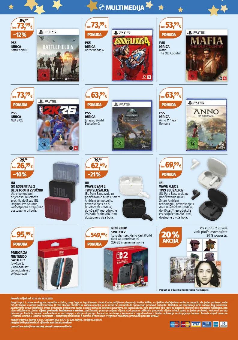 kom 95, 99 € ponuda kom 549, 00 € ponuda kom 62, 49 € − 21 % 79, 99 kom 26, 99 € − 10 % 29, 99 kom 69, 99 € ponuda kom 73, 99 € − 12 % 84, 99 kom 73, 99 € ponuda kom 53, 99 € ponuda kom 73, 99 € ponuda kom 63, 99 € ponuda kom 63, 99 € ponuda popust se oduzima nesporedno na blagajni. pribor za nintendo switch 2 joy-con 2, 2 komada set (svijetloplava / svijetloroza) nintendo switch 2 konzola + set mario kart world (kod za preuzimanje) 256 gb interne memorije jbl wave beam 2 tws slušalice jbl pure bass zvuk, uz poništavanje buke i smart ambient tehnologiju, povezivanje s do 8 bluetooth® uređaja, do 40 sati* reprodukcije (*s isključenim anc-om), dostupne u više boja. jbl go essential 2 bluetooth zvučnik ultra-kompaktni prijenosni bluetooth zvučnik, do 5 sati jbl original pro sounda, vodootporan dizajn ip67, dostupan u tri boje. jbl wave flex 2 tws slušalice jbl pure bass zvuk, uz poništavanje buke i smart ambient tehnologiju, povezivanje s do 8 bluetooth® uređaja, do 40 sati* reprodukcije (*s isključenim anc-om), dostupne u više boja. ps5 igrica battlefield 6 ps5 igrica borderlands 4 ps5 igrica mafia the old country ps5 igrica nba 2k26 ps5 igrica jurassic world evolution 3 ps5 igrica anno 117 pax romana 20 % akcija pri kupnji 2 ili više vinil ploča ostvarujete 20 % popusta. ponuda vrijedi od 10.11. do 16.11.2025. dragi kupci, i nama se dogode pogreške u tisku, zbog čega se ispričavamo. unatoč vrlo pažljivom planiranju tvrtke müller, u rijetkim slučajevima može se dogoditi da jedan proizvod neće biti dostupan u našim poslovnicama. u tom slučaju obratite se našem osoblju, a mi ćemo se potruditi da spomenuti proizvod dobijete. međutim, ne možemo jamčiti nabavu tog proizvoda. zadržavamo pravo pogreške. svoje proizvode prodajemo samo u količinama za potrebe kućanstva, do isteka zaliha. kod proizvoda koji rade na baterije, ukoliko nije drugačije navedeno, iste nisu uključene u cijenu. cijene proizvoda izražene su u eurima. zadržavamo pravo promjene cijena. kod grupno oslikanih proizvoda cijena vrijedi samo za jedan proizvod. proizvodi su bez dekoracije. različiti popusti međusobno se ne zbrajaju, a akcije isključuju. popust se ne zbraja s kuponima i pogodnostima iz müller aplikacije za skupljanje bodova. ponuda vrijedi samo za hrvatsku. upisan u upisnik subjekata u ekološkoj proizvodnji s pravom distribucije / trgovine ekoloških proizvoda pod ibk 499922. müller trgovina zagreb d.o.o., oreškovićeva 6h/1, 10 020 zagreb, info@mueller.hr pregled svih poslovnica i njihovih asortimana možete pronaći na našoj internetskoj stranici www.mueller.hr. multimedija