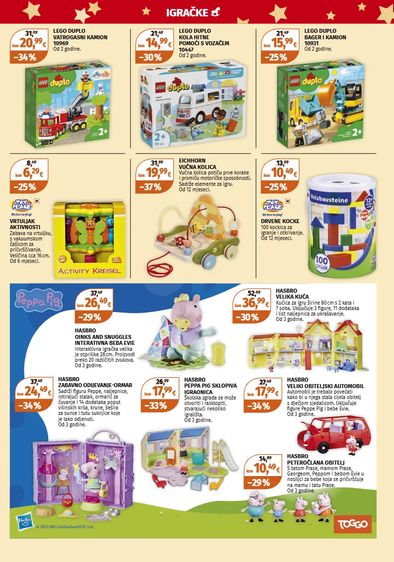 d. © 2025 abd ltd/hasbro/hcpl ltd. kom 19, 99 € − 37 % 31, 99 kom 20, 99 € − 34 % 31, 99 kom 15, 99 € − 25 % 21, 49 kom 14, 99 € − 30 % 21, 49 kom 6, 29 € − 25 % 8, 49 kom 10, 49 € − 25 % 13, 99 kom 26, 49 € − 29 % 37, 49 kom 36, 99 € − 30 % 52, 99 kom 17, 99 € − 34 % 27, 49 kom 10, 49 € − 29 % 14, 89 kom 24, 49 € − 34 % 37, 49 kom 17, 99 € − 33 % 26, 99 lego duplo vatrogasni kamion 10969 od 2 godine. lego duplo bager i kamion 10931 od 2 godine. lego duplo kola hitne pomoći s vozačem 10447 od 2 godine. vrtuljak aktivnosti zabava na vrtuljku, s vakuumskom čašicom za pričvršćivanje. veličina cca 16 cm. od 6 mjeseci. drvene kocke 100 kockica za igranje i otkrivanje. od 12 mjeseci. eichhorn vučna kolica vučna kolica potiču prve korake i promiču motoričke sposobnosti. sadrže elemente za igru. od 12 mjeseci. hasbro oinks and snuggles interativna beba evie interaktivna igračka velika je otprilike 28 cm. proizvodi preko 20 različitih zvukova. od 3 godine. hasbro velika kuća kućica za igru širine 80 cm s 2 kata i 7 soba. uključuje 3 figure, 11 dodataka i list naljepnica za ukrašavanje. od 3 godine. hasbro veliki obiteljski automobil automobil je trebalo povećati kako bi u njega stala cijela obitelj s dječjom sjedalicom. uključuje figure peppe pig i bebe evie. od 3 godine. hasbro zabavno odijevanje-ormar sadrži figuru peppe, naljepnice, rotirajući stalak, ormarić za čuvanje i 14 dodataka poput vilinskih krila, krune, šešira za sunce i tutu suknjice koje je lako odjenuti. od 3 godine. hasbro peppa pig sklopiva igraonica školska zgrada se može otvoriti i rasklopiti, stvarajući nekoliko igrališta. od 3 godine. hasbro peteročlana obitelj s tatom prase, mamom prase, georgeom, peppom i bebom evie u nosiljci za bebe koja se pričvršćuje na mamu i tatu prase. od 3 godine. spielwaren igračke
