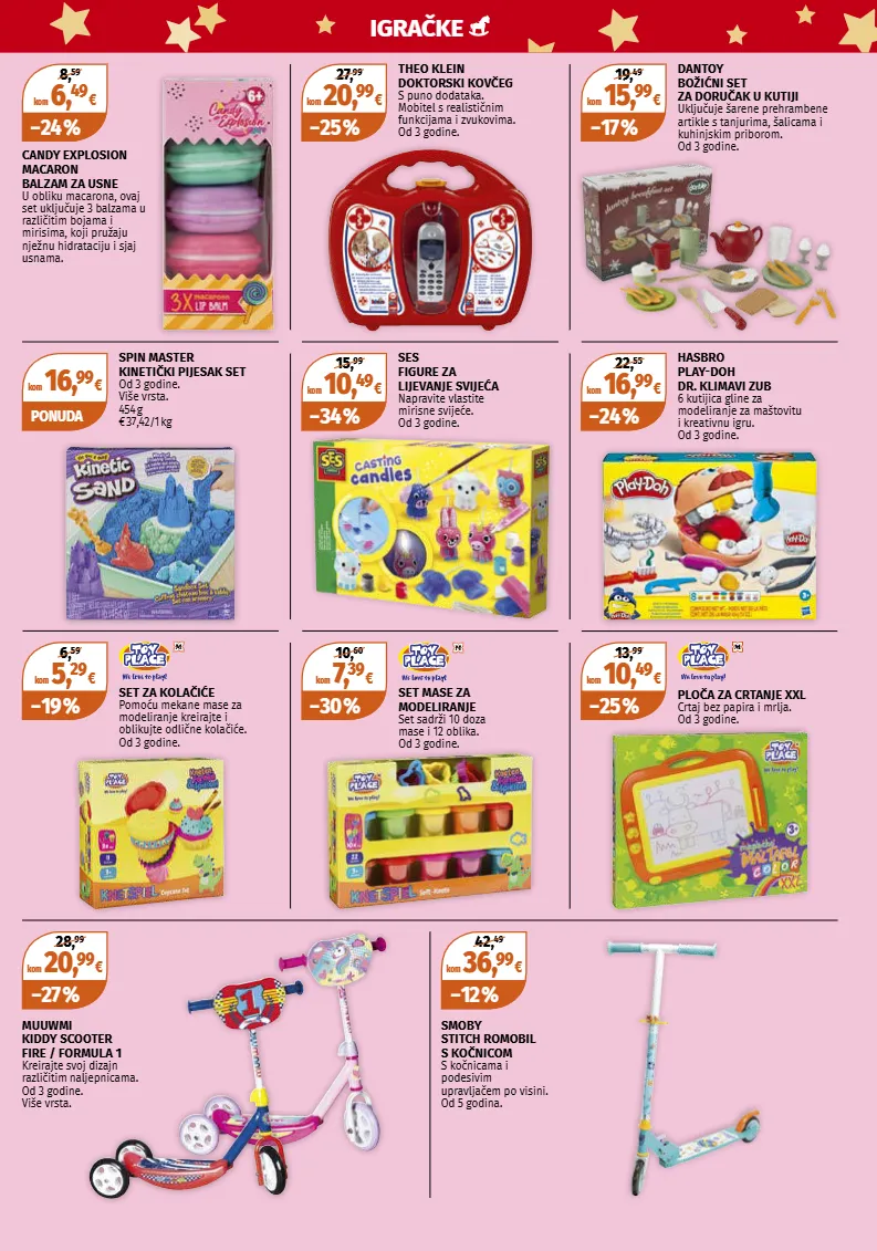 kom 10, 49 € − 17 % 12, 69 kom 28, 49 € − 22 % 36, 99 kom 10, 49 € − 19 % 12, 99 kom 12, 99 € − 24 % 17, 29 kom 12, 99 € − 27 % 17, 99 kom 7, 39 € − 30 % 10, 59 kom 24, 99 € − 32 % 36, 99 kom 15, 99 € − 25 % 21, 49 kom 17, 99 € − 16 % 21, 49 kom 20, 99 € − 22 % 26, 99 kom 24, 99 € − 32 % 36, 99 CHICCO BABY MOBITEL SA SLIKAMA S različitim tonovima zvona i svjetlosnim efektima. Od 6 mjeseci. CHICCO ELEKTRONSKA PODLOGA ZA SKAKANJE Od 18 mjeseci. KUĆICA ZA UČENJE I RAZVRSTAVANJE Sadrži 6 šarenih kockica za sortiranje. S melodijama i raznim zvukovima. Od 12 mjeseci. DRVO VRTULJAK Okreni drvce ili pritisni tipke za zabavne zvukove, melodije i bljeskajuća svjetla. Od 6 mjeseci. STERNTALER MINI IGRAČKA MAGARAC EMILIUS ILI EMILIA Mekana umiljata igračka sa zvečkom. Od rođenja. PUŽI SA MNOM MINNIE Imitirajući puzanje, djeca poboljšavaju svoje motoričke sposobnosti. Od 6 mjeseci. CHICCO MAČKA KOJA PREDE Od rođenja. FISHER PRICE MAZNA KAPIBARA S prstenom za zube i zvečkom. Promiče finu motoriku. Od 3 mjeseca. FISHER-PRICE POSPANA KOALA Ova plišana igračka koala svira umirujuće zvukove i idealna je za igru u pokretu. Mekane uši i prišivene mašne potiču senzorno istraživanje. Od rođenja. PUŽI SA MNOM STITCH Imitirajući puzanje, djeca poboljšavaju svoje motoričke sposobnosti. Od 6 mjeseci. PODMORNICA PROJEKTOR Pritisni periskop i pusti da obasja kadu sjajnim morskim motivima. Od 12 mjeseci. IGRAČKE