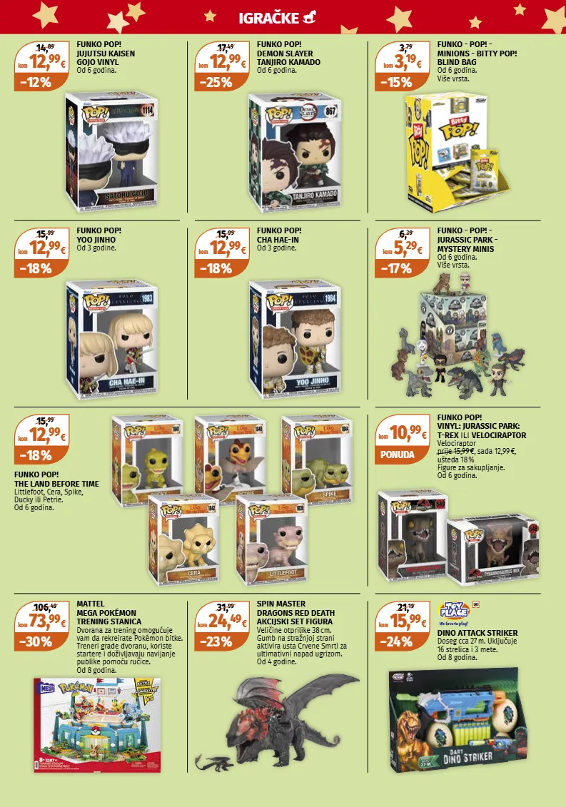 kom 12, 99 € − 18 % 15, 99 kom 12, 99 € − 18 % 15, 99 kom 5, 29 € − 17 % 6, 39 kom 24, 49 € − 23 % 31, 99 kom 12, 99 € − 12 % 14, 89 kom 12, 99 € − 25 % 17, 49 kom 3, 19 € − 15 % 3, 79 kom 73, 99 € − 30 % 106, 49 kom 10, 99 € PONUDA kom 12, 99 € − 18 % 15, 99 kom 15, 99 € − 24 % 21, 19 FUNKO POP! YOO JINHO Od 3 godine. FUNKO POP! CHA HAE-IN Od 3 godine. FUNKO - POP! - JURASSIC PARK - MYSTERY MINIS Od 6 godina. Više vrsta. SPIN MASTER DRAGONS RED DEATH AKCIJSKI SET FIGURA Veličine otprilike 38 cm. Gumb na stražnjoj strani aktivira usta Crvene Smrti za ultimativni napad ugrizom. Od 4 godine. FUNKO POP! JUJUTSU KAISEN GOJO VINYL Od 6 godina. FUNKO POP! DEMON SLAYER TANJIRO KAMADO Od 6 godina. FUNKO POP! THE LAND BEFORE TIME Littlefoot, Cera, Spike, Ducky ili Petrie. Od 6 godina. MATTEL MEGA POKÉMON TRENING STANICA Dvorana za trening omogućuje vam da rekreirate Pokémon bitke. Treneri grade dvoranu, koriste startere i doživljavaju navijanje publike pomoću ručice. Od 8 godina. FUNKO - POP! - MINIONS - BITTY POP! BLIND BAG Od 6 godina. Više vrsta. DINO ATTACK STRIKER Doseg cca 27 m. Uključuje 16 strelica i 3 mete. Od 8 godina. FUNKO POP! VINYL: JURASSIC PARK: T-REX ILI VELOCIRAPTOR Velociraptor prije 15,99 €, sada 12,99 €, ušteda 18 % Figure za sakupljanje. Od 6 godina. SPIELWAREN IGRAČKE