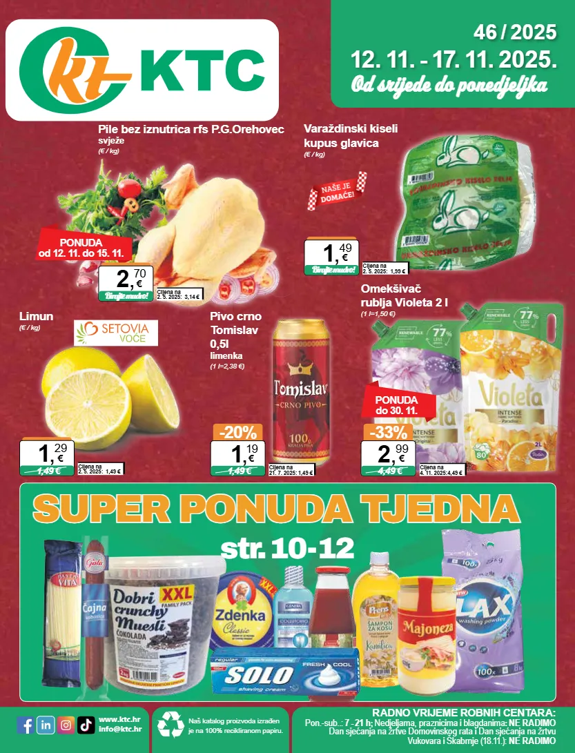 naš katalog proizvoda izrađen je na 100% recikliranom papiru. radno vrijeme robnih centara: pon.-sub..: 7 - 21 h ; nedjeljama, praznicima i blagdanima : ne radimo www.ktc.hr info@ktc.hr 46 / 2025 12. 11. - 17. 11. 2025. od srijede do ponedjeljka dan sjećanja na žrtve domovinskog rata i dan sjećanja na žrtvu vukovara i škabrnje (18.11.): ne radimo super ponuda tjedna super ponuda tjedna str. 10-12 cijena na 2. 5. 2025: 3,14 € cijena na 2. 5. 2025: 1,99 € cijena na 2. 5. 2025: 1,49 € cijena na 4. 11. 2025:4,49 € cijena na 21. 7. 2025: 1,49 € ponuda od 12. 11. do 15. 11. pile bez iznutrica rfs p.g.orehovec svježe (€ / kg) birajte mudro! 2 , 70 € varaždinski kiseli kupus glavica (€ / kg) birajte mudro! 1 , 49 € limun (€ / kg) 1,49 € 1 , 29 € ponuda do 30. 11. omekšivač rublja violeta 2 l (1 l=1,50 €) -33% 4,49 € 2 , 99 € -20% 1,49 € 1 , 19 € pivo crno tomislav 0,5l limenka (1 l=2,38 €)