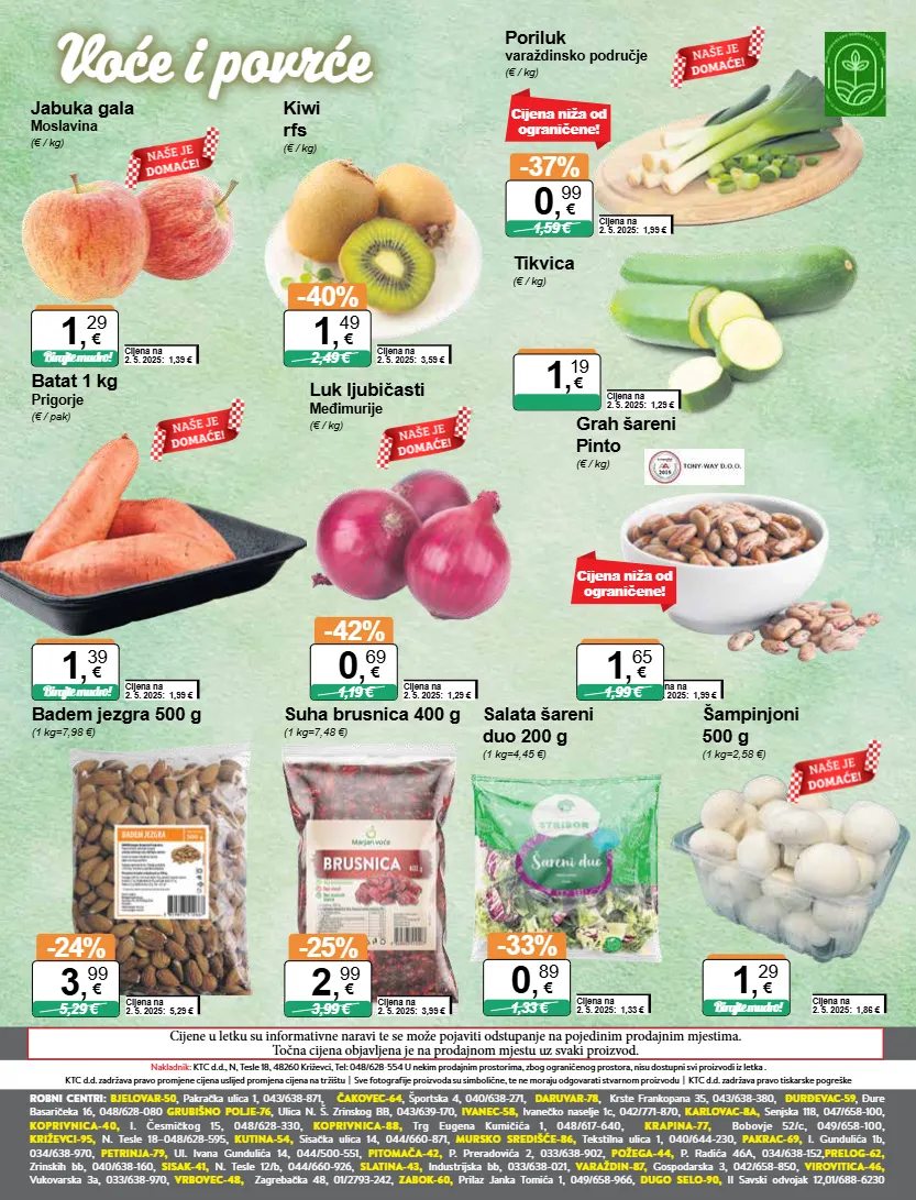 nakladnik: ktc d.d., n, tesle 18, 48260 križevci, tel: 048/628-554 u nekim prodajnim prostorima, zbog ograničenog prostora, nisu dostupni svi proizvodi iz letka . ktc d.d. zadržava pravo promjene cijena uslijed promjena cijena na tržištu | sve fotografije proizvoda su simbolične, te ne moraju odgovarati stvarnom proizvodu | ktc d.d. zadržava pravo tiskarske pogreške robni centri: bjelovar-50 , pakračka ulica 1, 043/638-871, čakovec-64 , športska 4, 040/638-271, daruvar-78 , krste frankopana 35, 043/638-380, đurđevac-59 , đure basaričeka 16, 048/628-080 grubišno polje-76 , ulica n. š. zrinskog bb, 043/639-170, ivanec-58, ivanečko naselje 1c, 042/771-870, karlovac-8a, senjska 118, 047/658-100, koprivnica-40, i. česmičkog 15, 048/628-330, koprivnica-88, trg eugena kumičića 1, 048/617-640, krapina-77, bobovje 52/c, 049/658-100, križevci-95, n. tesle 18–048/628-595, kutina-54, sisačka ulica 14, 044/660-871, mursko središće-86, tekstilna ulica 1, 040/644-230, pakrac-69, i. gundulića 1b, 034/638-970, petrinja-79, ul. ivana gundulića 14, 044/500-551, pitomača-42, p. preradovića 2, 033/638-902, požega-44, p. radića 46a, 034/638-152, prelog-62, zrinskih bb, 040/638-160, sisak-41, n. tesle 12/b, 044/660-926, slatina-43, industrijska bb, 033/638-021, varaždin-87, gospodarska 3, 042/658-850, virovitica-46, vukovarska 3a, 033/638-970, vrbovec-48, zagrebačka 48, 01/2793-242, zabok-60, prilaz janka tomića 1, 049/658-966, dugo selo-90, ii savski odvojak 12,01/688-6230 cijene u letku su informativne naravi te se može pojaviti odstupanje na pojedinim prodajnim mjestima. točna cijena objavljena je na prodajnom mjestu uz svaki proizvod. cijena na 2. 5. 2025: 5,29 € cijena na 2. 5. 2025: 3,99 € cijena na 2. 5. 2025: 1,99 € cijena na 2. 5. 2025: 1,33 € cijena na 2. 5. 2025: 1,86 € cijena na 2. 5. 2025: 1,99 € cijena na 2. 5. 2025: 1,29 € cijena na 2. 5. 2025: 1,99 € cijena na 2. 5. 2025: 1,39 € cijena na 2. 5. 2025: 3,59 € cijena na 2. 5. 2025: 1,29 € badem jezgra 500 g (1 kg=7,98 €) -24% 5,29 € 3 , 99 € suha brusnica 400 g (1 kg=7,48 €) -25% 3,99 € 2 , 99 € batat 1 kg prigorje (€ / pak) birajte mudro! 1 , 39 € salata šareni duo 200 g (1 kg=4,45 €) -33% 1,33 € 0 , 89 € šampinjoni 500 g (1 kg=2,58 €) birajte mudro! 1 , 29 € cijena niža od ograničene! cijena niža od ograničene! poriluk varaždinsko područje (€ / kg) -37% 1,59 € 0 , 99 € luk ljubičasti međimurije (€ / kg) -42% 1,19 € 0 , 69 € grah šareni pinto (€ / kg) 1,99 € 1 , 65 € jabuka gala moslavina (€ / kg) birajte mudro! 1 , 29 € kiwi rfs (€ / kg) -40% 2,49 € 1 , 49 € tikvica (€ / kg) 1 , 19 € voće i povrće