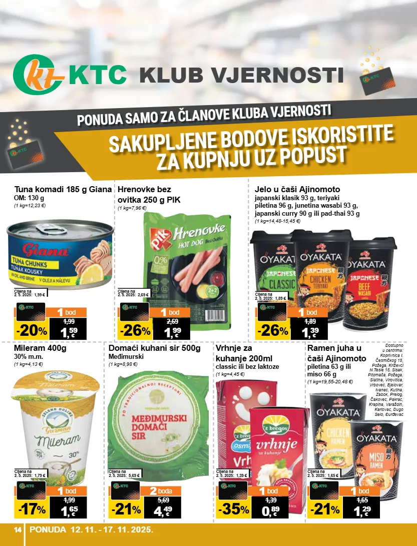 ponuda samo za članove kluba vjernosti sakupljene bodove iskoristite za kupnju uz popust klub vjernosti 14 ponuda 17.9. - 23.9.2025. dostupno u centrima: koprivnica i. česmičkog 15, požega, križevci n.tesle 18, sisak, pitomača, požega, slatina, virovitica, vrbovec, bjelovar, ivanec, kutina, zabok, prelog, čakovec, pakrac, krapina, varaždin, karlovac, dugo selo, đurđevac cijena na 2. 5. 2025: 1,99 € cijena na 2. 5. 2025: 2,69 € cijena na 2. 5. 2025: 1,79 € cijena na 2. 5. 2025: 5,69 € cijena na 2. 5. 2025: 1,39 € cijena na 2. 5. 2025: 1,89 € cijena na 2. 5. 2025: 1,65 € 1,99 1 , 59 - 20 % 1 bod € 2,69 1 , 99 - 26 % 1 bod € tuna komadi 185 g giana om: 130 g (1 kg=12,23 €) hrenovke bez ovitka 250 g pik (1 kg=7,96 €) 1,99 1 , 65 - 17 % 1 bod € 5,69 4 , 49 - 21 % 2 boda € 1,39 0 , 89 - 35 % 1 bod € mileram 400g 30% m.m. (1 kg=4,13 €) domaći kuhani sir 500g međimurski (1 kg=8,98 €) vrhnje za kuhanje 200ml classic ili bez laktoze (1 kg=4,45 €) 1,89 1 , 39 - 26 % 1 bod € 1,65 1 , 29 - 21 % 1 bod € jelo u čaši ajinomoto japanski klasik 93 g, teriyaki piletina 96 g, junetina wasabi 93 g, japanski curry 90 g ili pad-thai 93 g (1 kg=14,48-15,45 €) ramen juha u čaši ajinomoto piletina 63 g ili miso 66 g (1 kg=19,55-20,48 €) 14 ponuda 12. 11. - 17. 11. 2025.